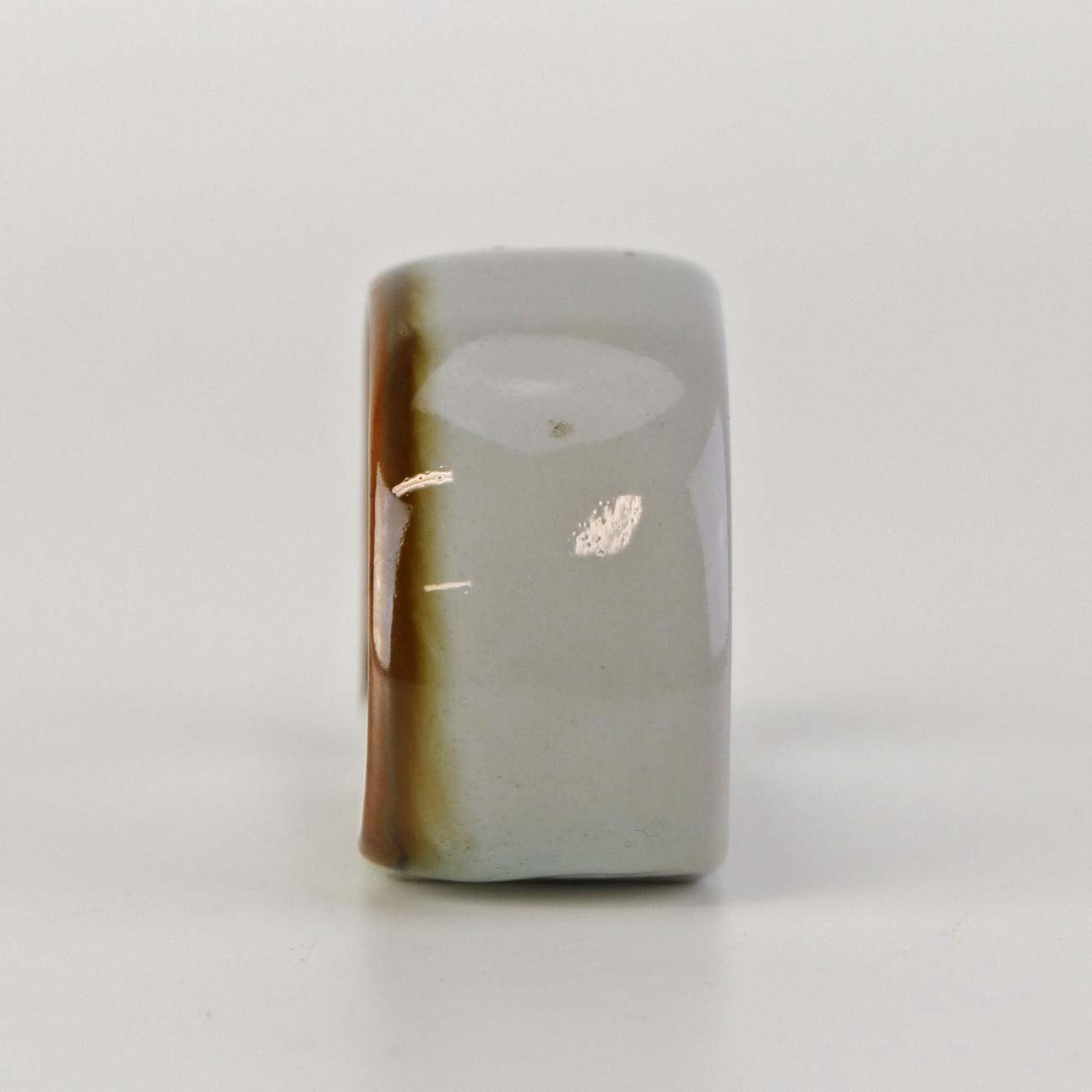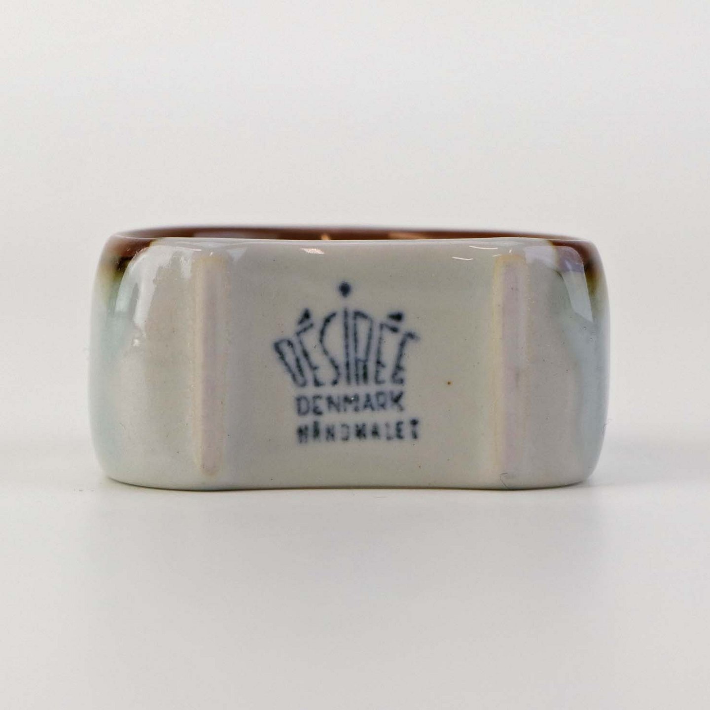 Diskos er af ovnfast stentøj. Stellet er gråt og håndmalet med brune og grønlige detaljer.