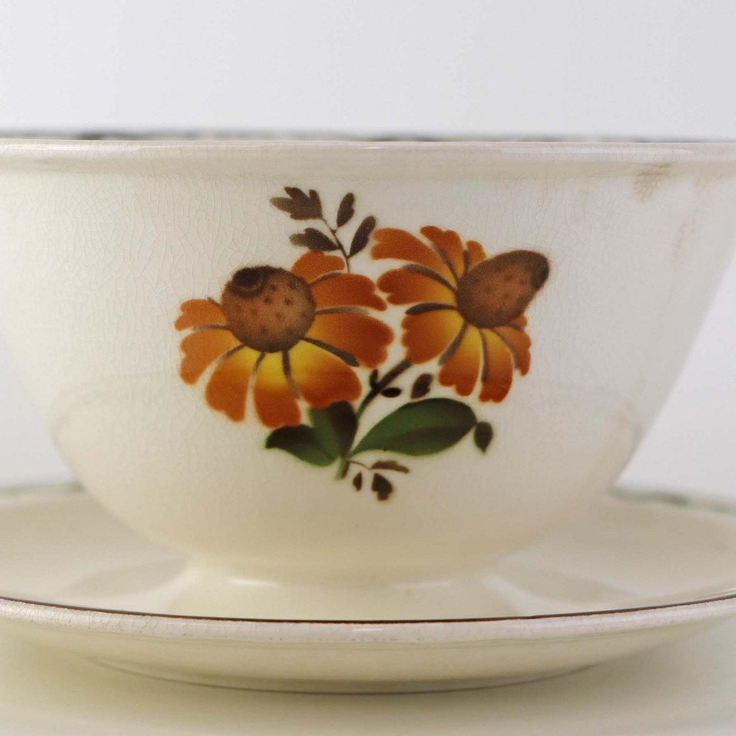 Fajancestel i stelform G med dekoration af orangegule blomster og grønne guirlander på lys baggrund med brun kant.