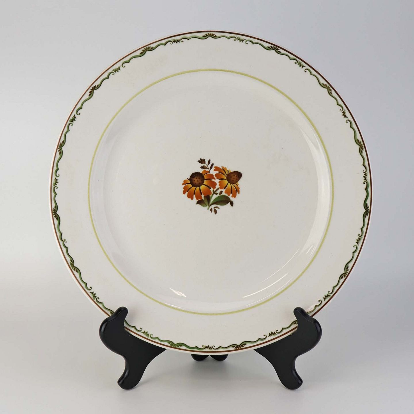 Fajancestel i stelform G med dekoration af orangegule blomster og grønne guirlander på lys baggrund med brun kant.