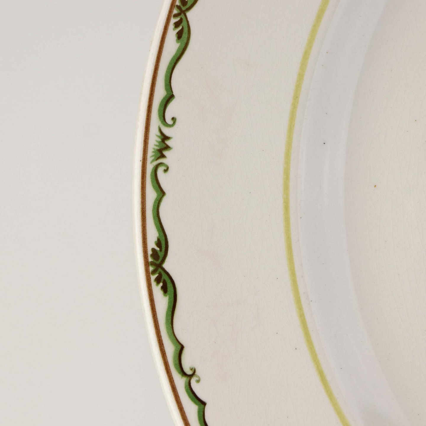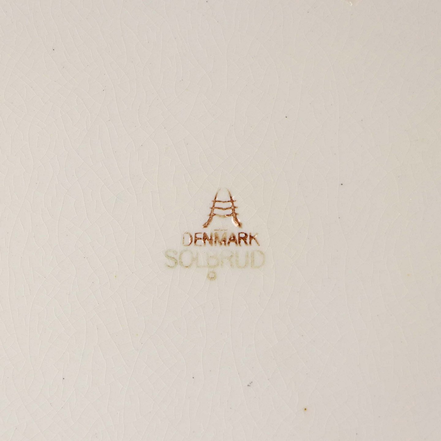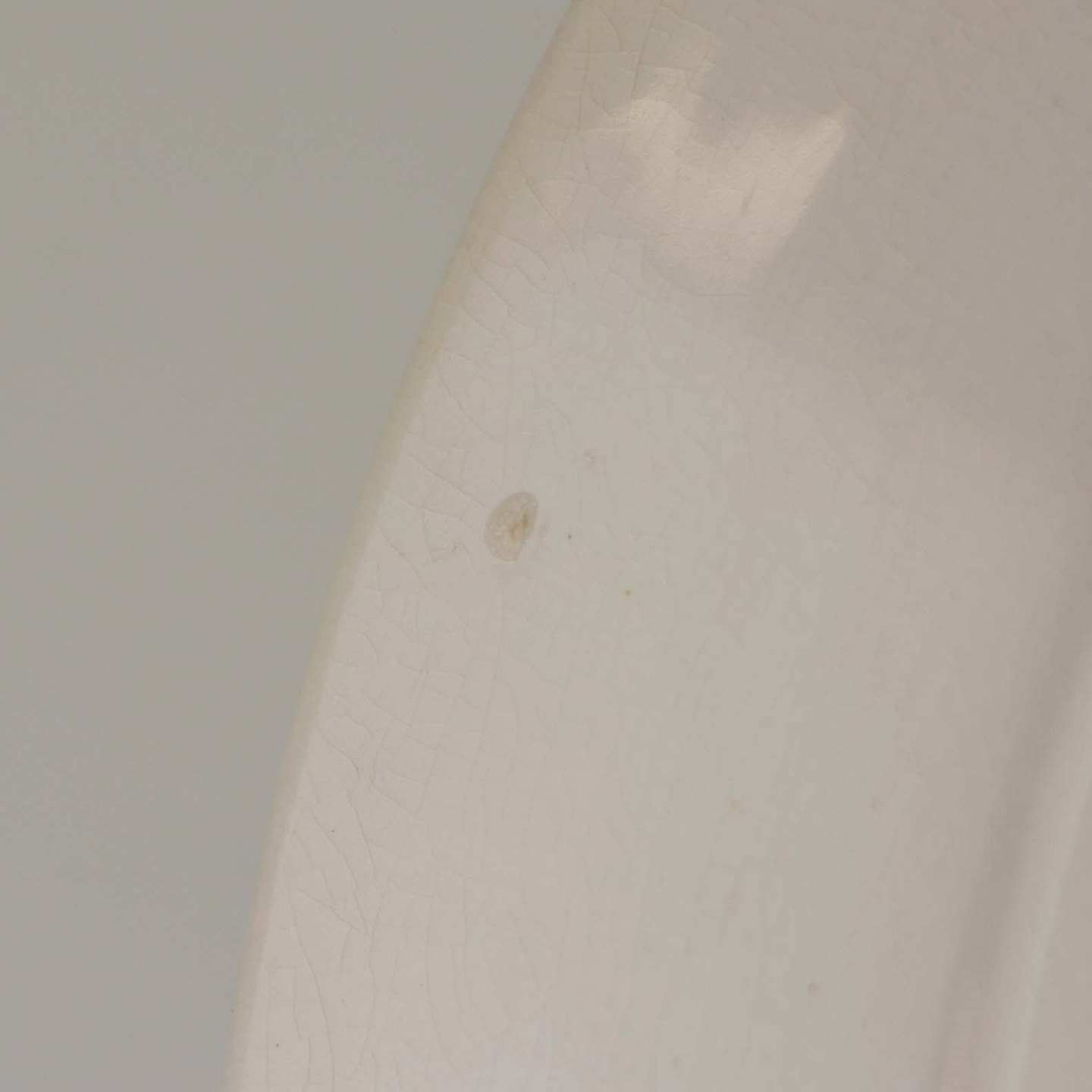 Fremstår med ujævnheder i glasuren på bagsiden, krakkeleringer i glasuren og mindre områder med bruneringer under glasuren.