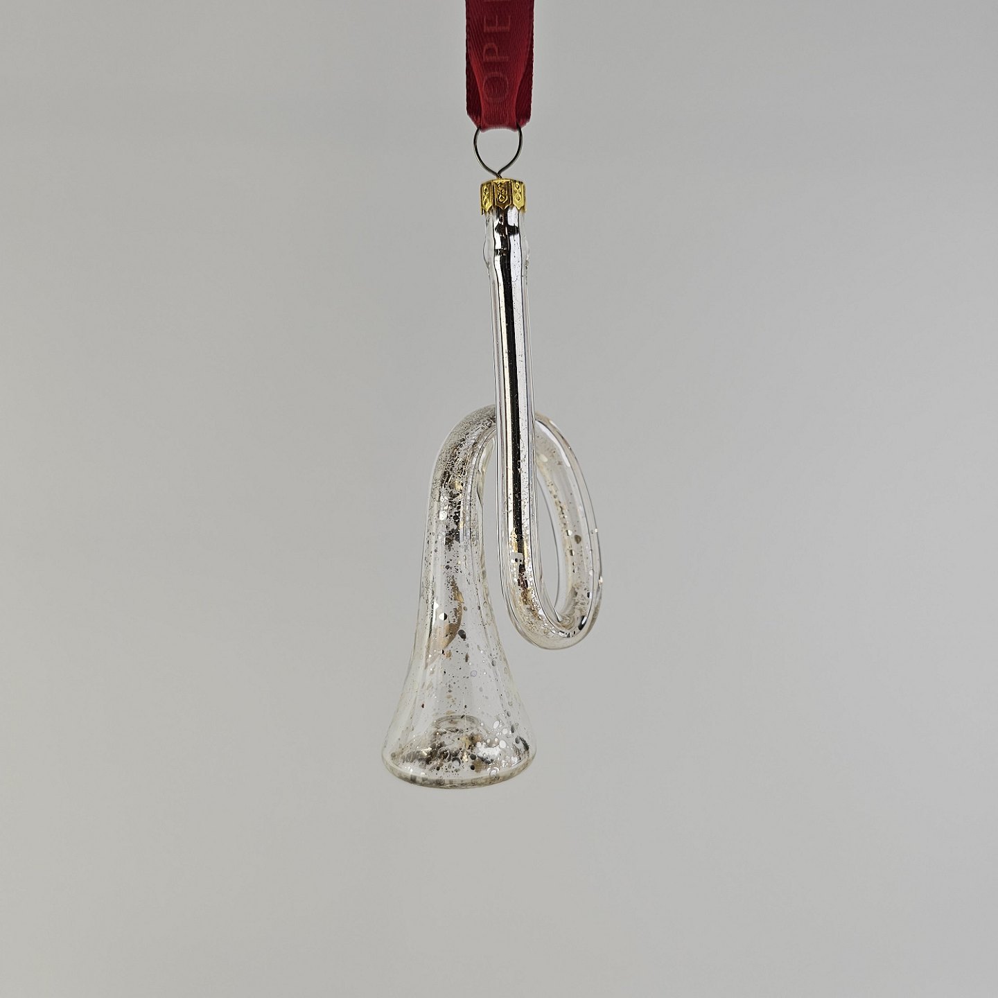 Juleornamenter i glas med motiv af et hjerte og en trompet med rødt bånd til ophæng