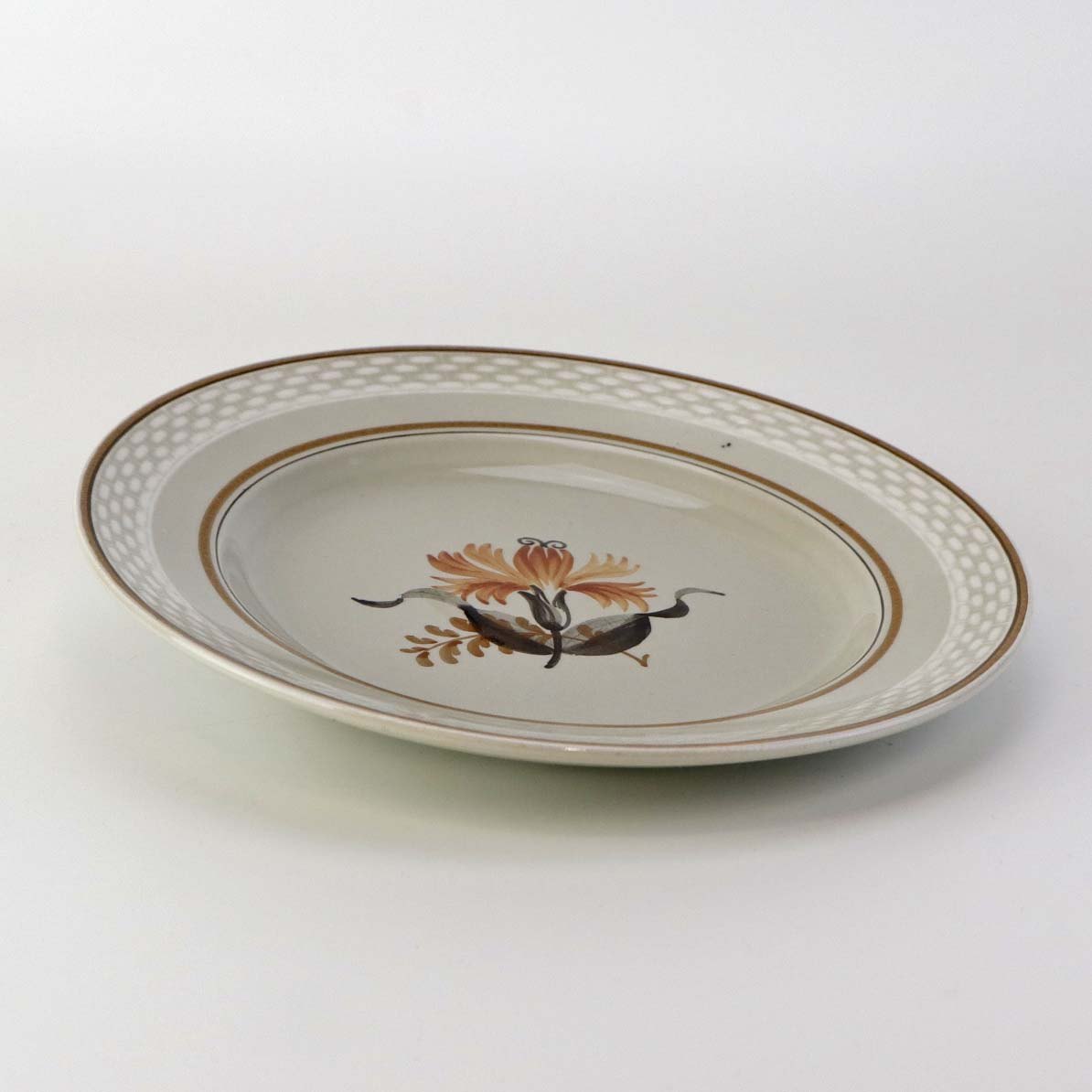 Fajancestellet er i stelformen Viktoria II med dekoration af orangebrune blomster på gråtonet baggrund med brun kant.