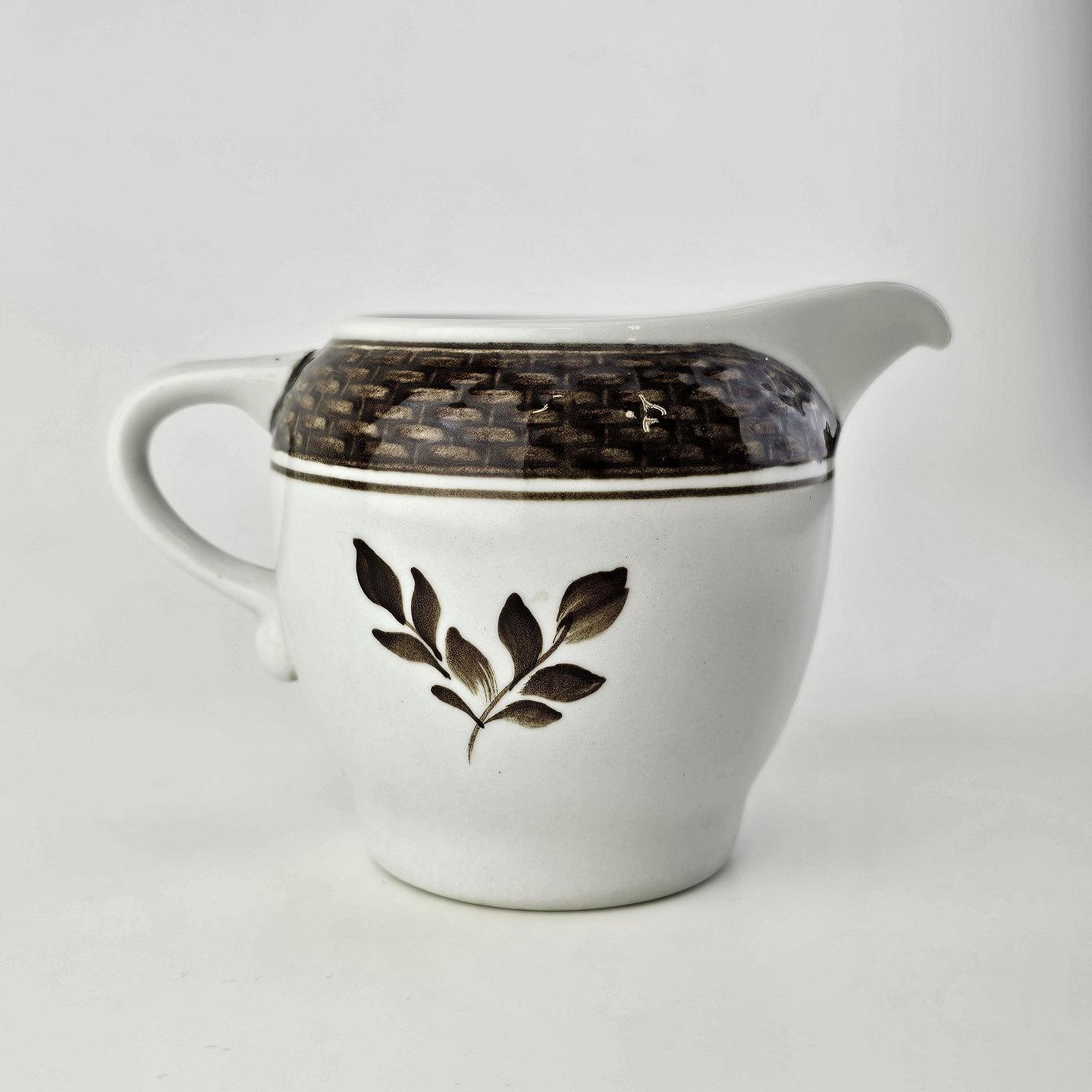 Fajancestellet med flettet kant og dekoration af brune blomster på lys baggrund med brun kant