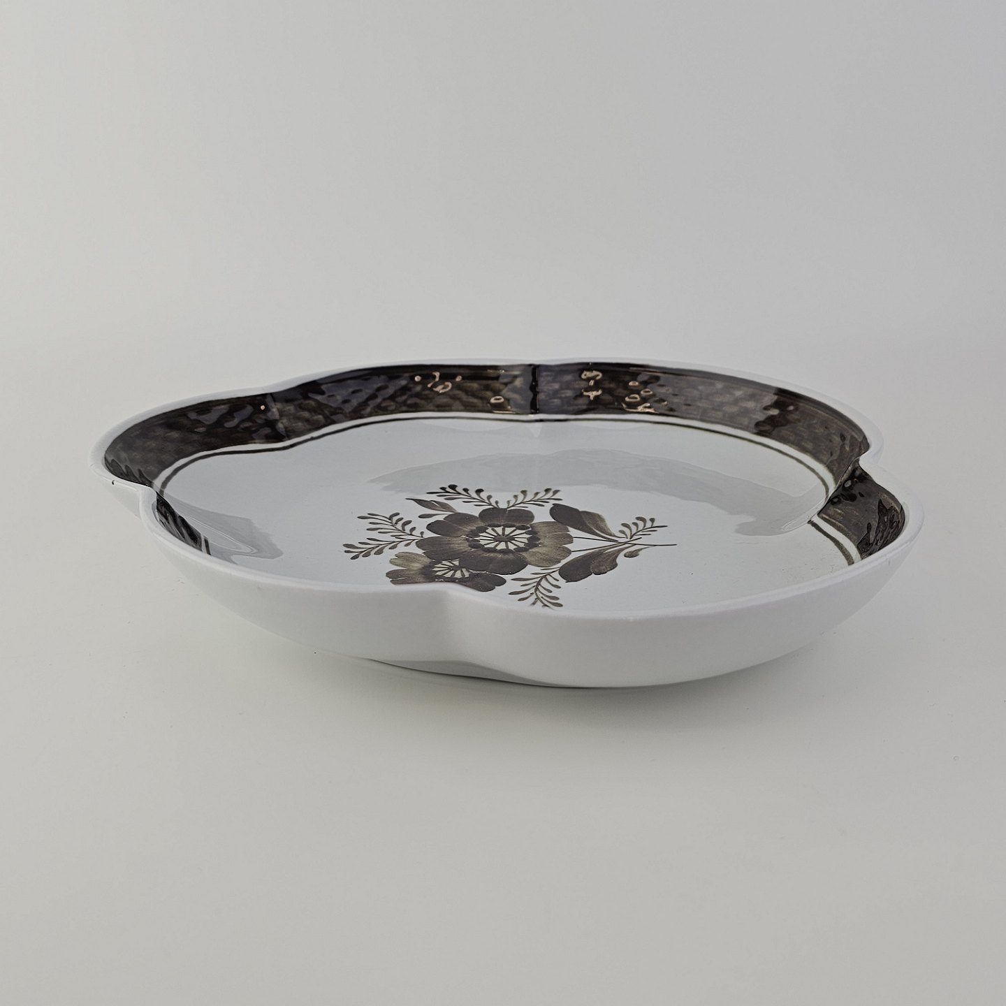 Fajancestellet med flettet kant og dekoration af brune blomster på lys baggrund med brun kant