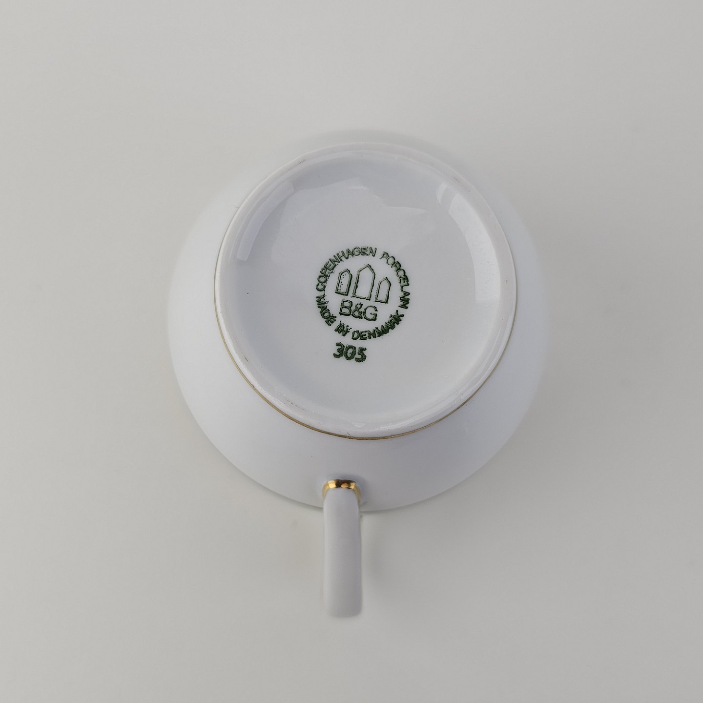 Thorvaldsen er stel i glat hvidt porcelæn med lysegrøn bort, forgyldt dekoration og guldkant