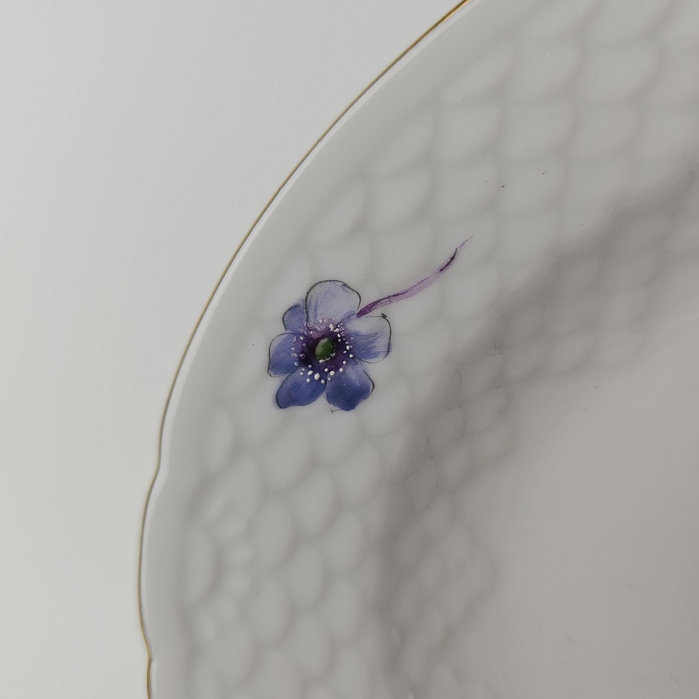 Antonius er af hvidt porcelæn med skælform dekoreret med håndmalede blå anemoner og guldkant. Også kendt under navnet Blå Anemone.