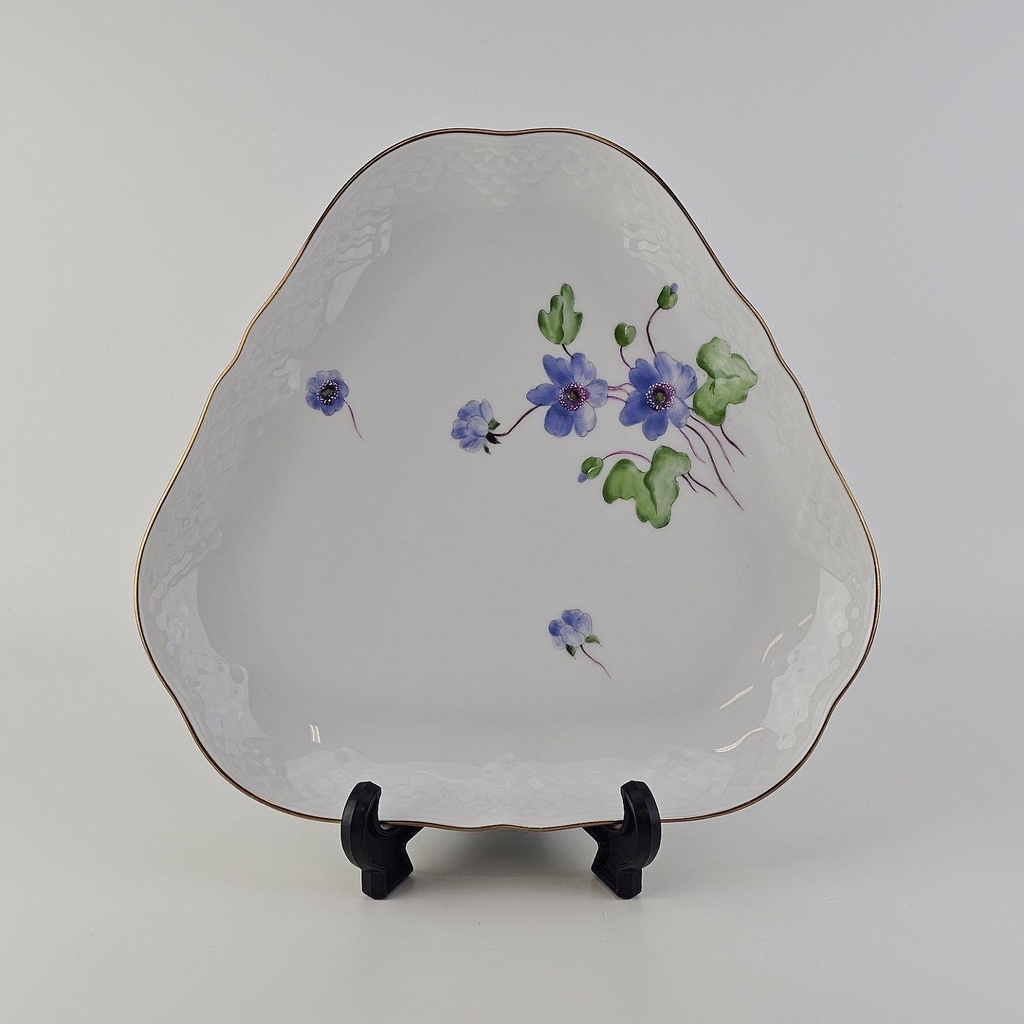 Antonius er af hvidt porcelæn med skælform dekoreret med håndmalede blå anemoner og guldkant. Også kendt under navnet Blå Anemone.