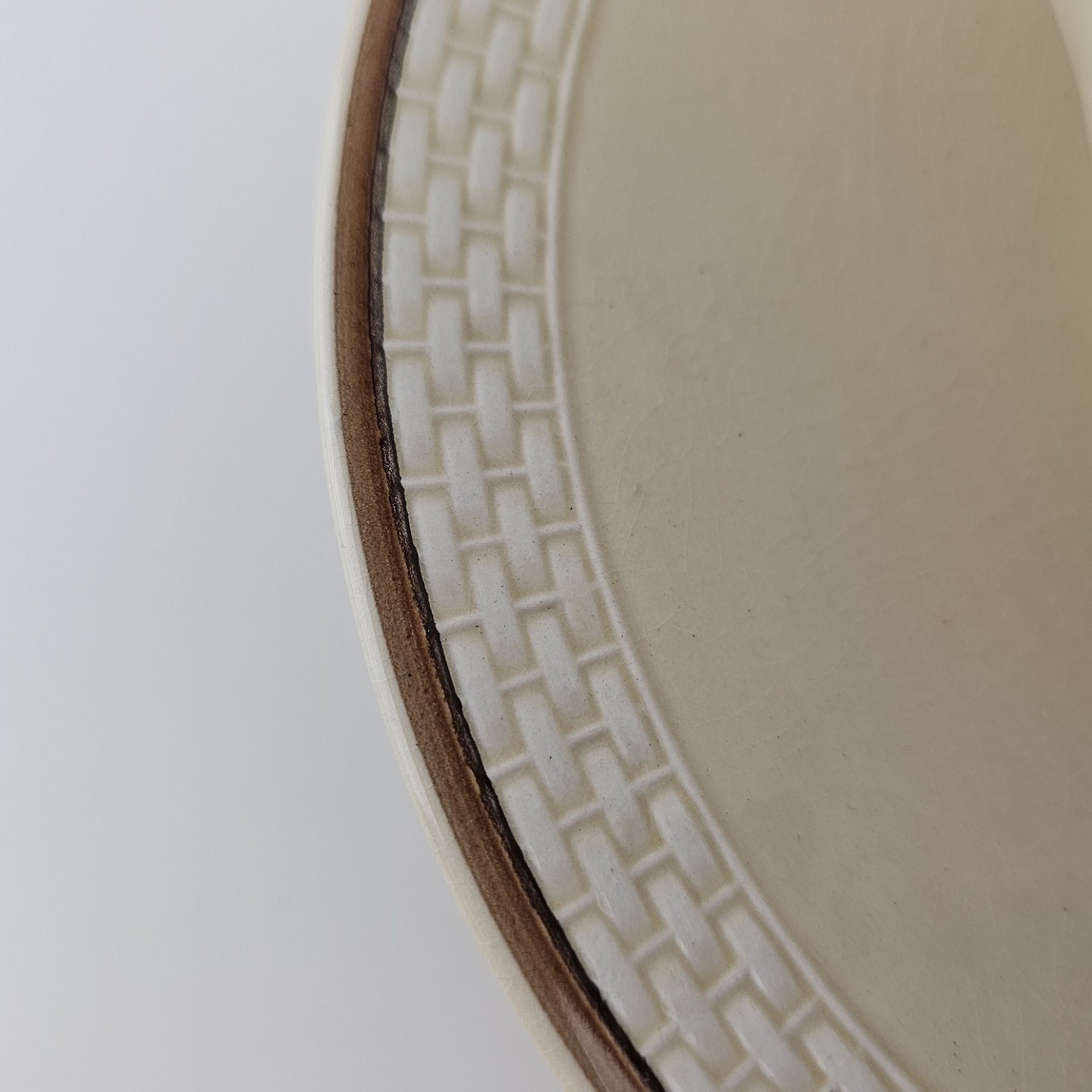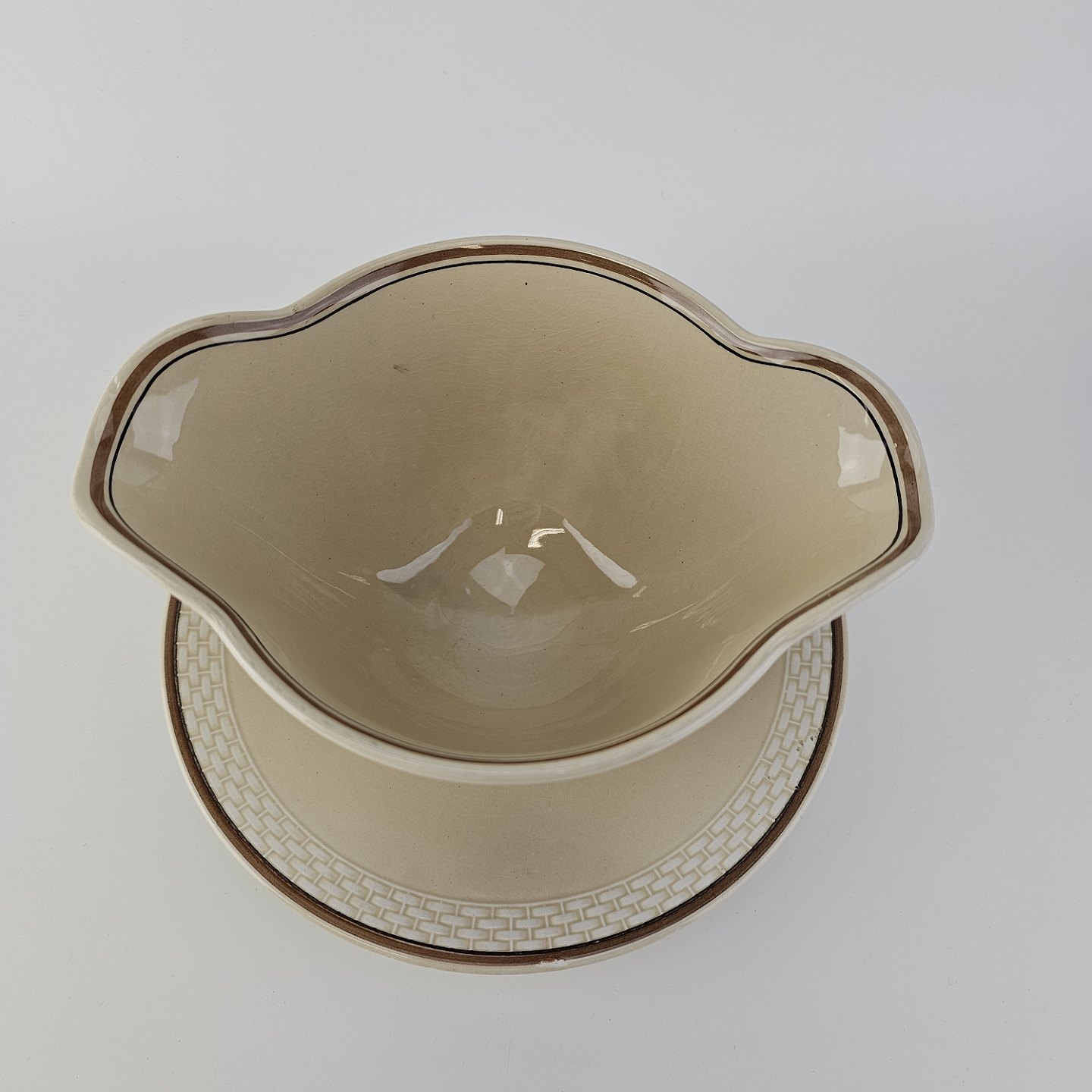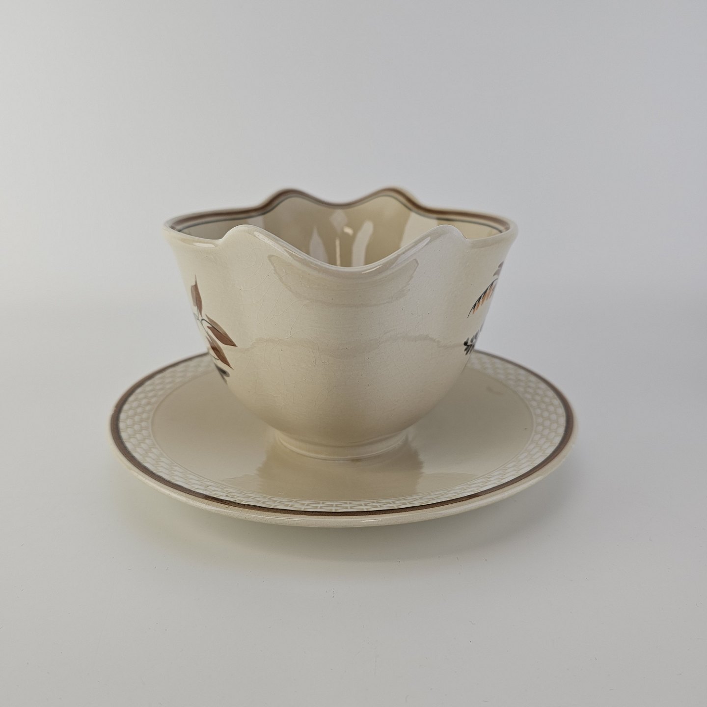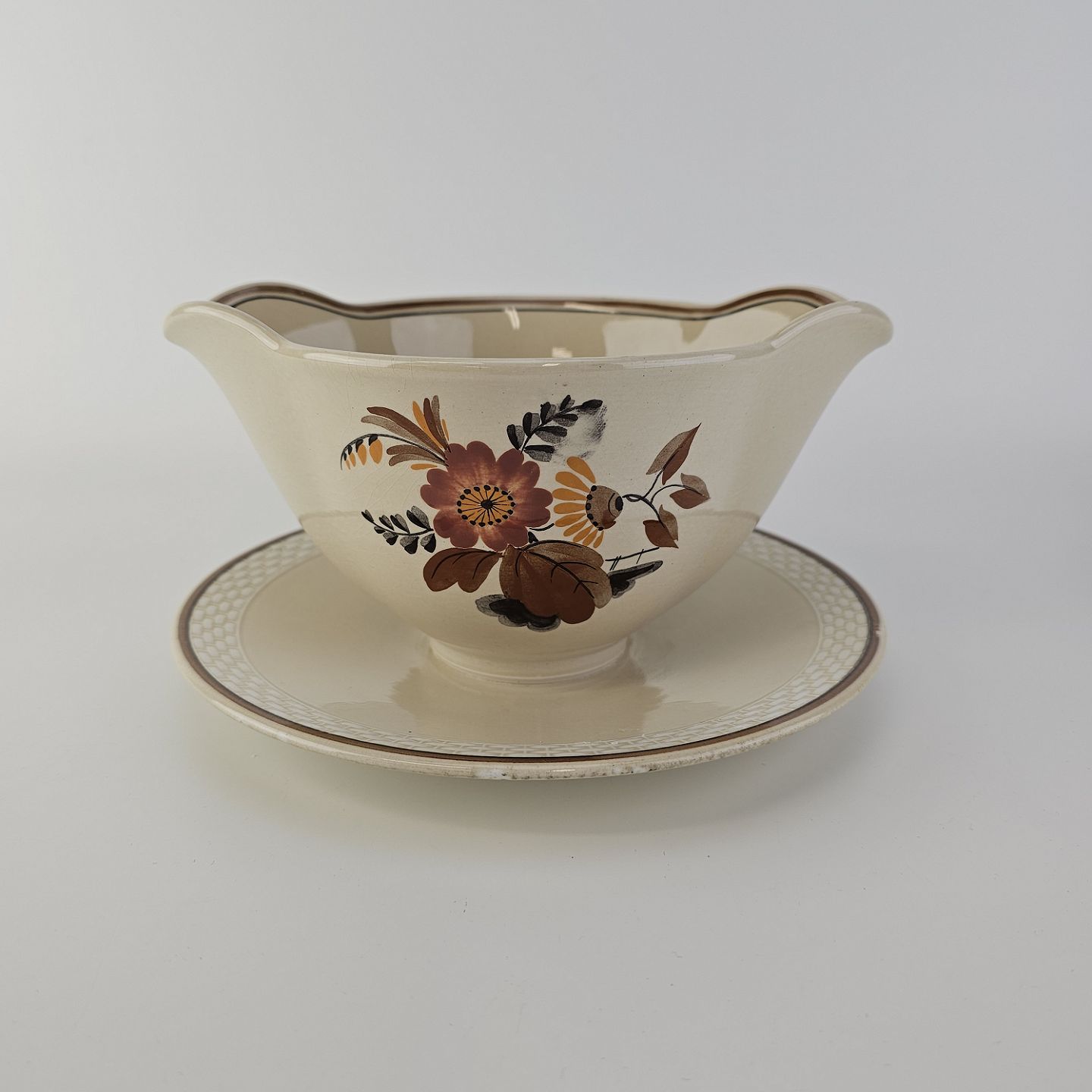 Knud er cremefarvet fajance dekoreret med flettet kant og brune og orange blomster. Stellet blev produceret i år 1934-1963.