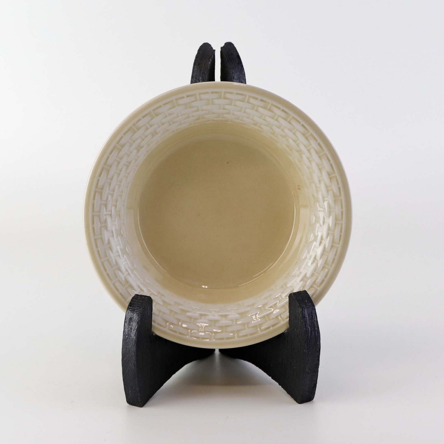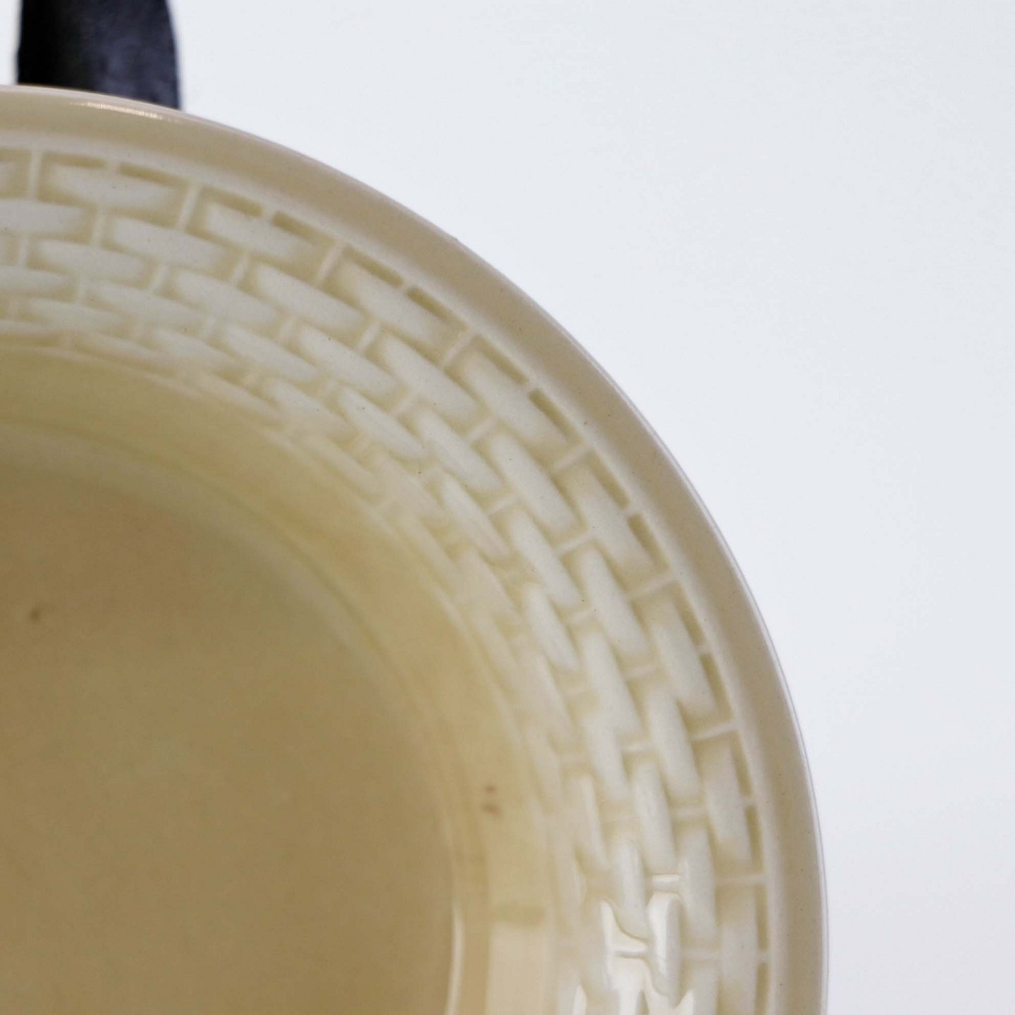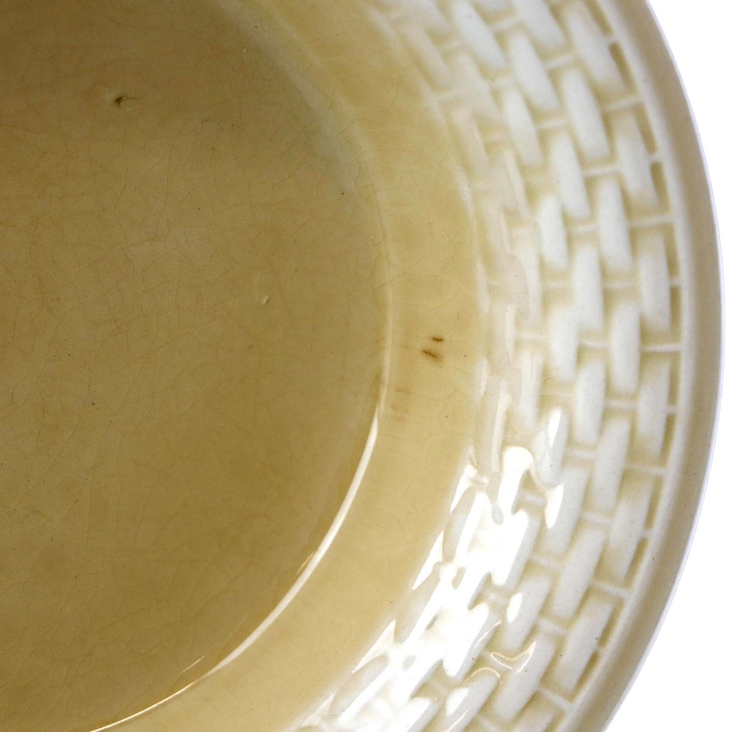 Sandfarvet fajancestel i stelform Viktoria II - Fletværk med dekoration af hvidt flet på gullig baggrund.