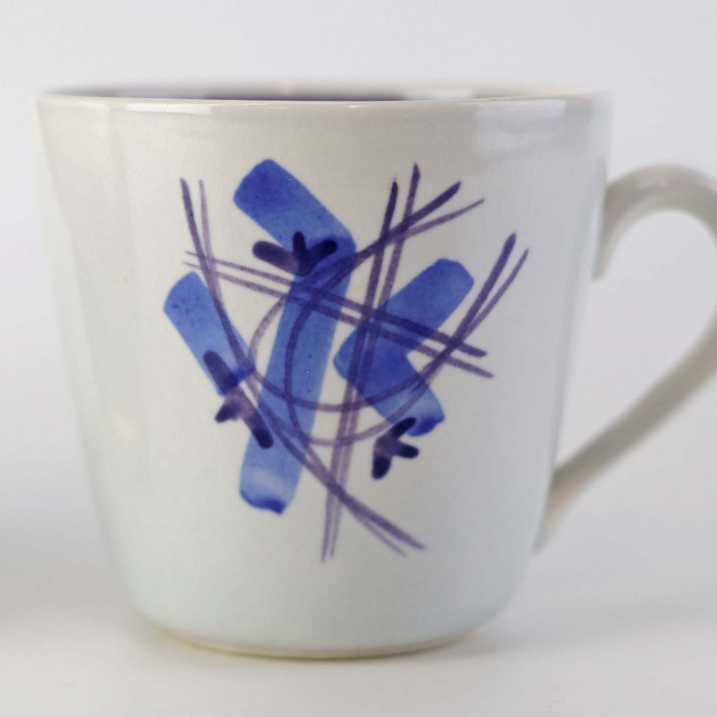 Fajancestel i stelform CA med dekoration af abstrakt motiv i blå og lyseblå på en råhvid baggrund.