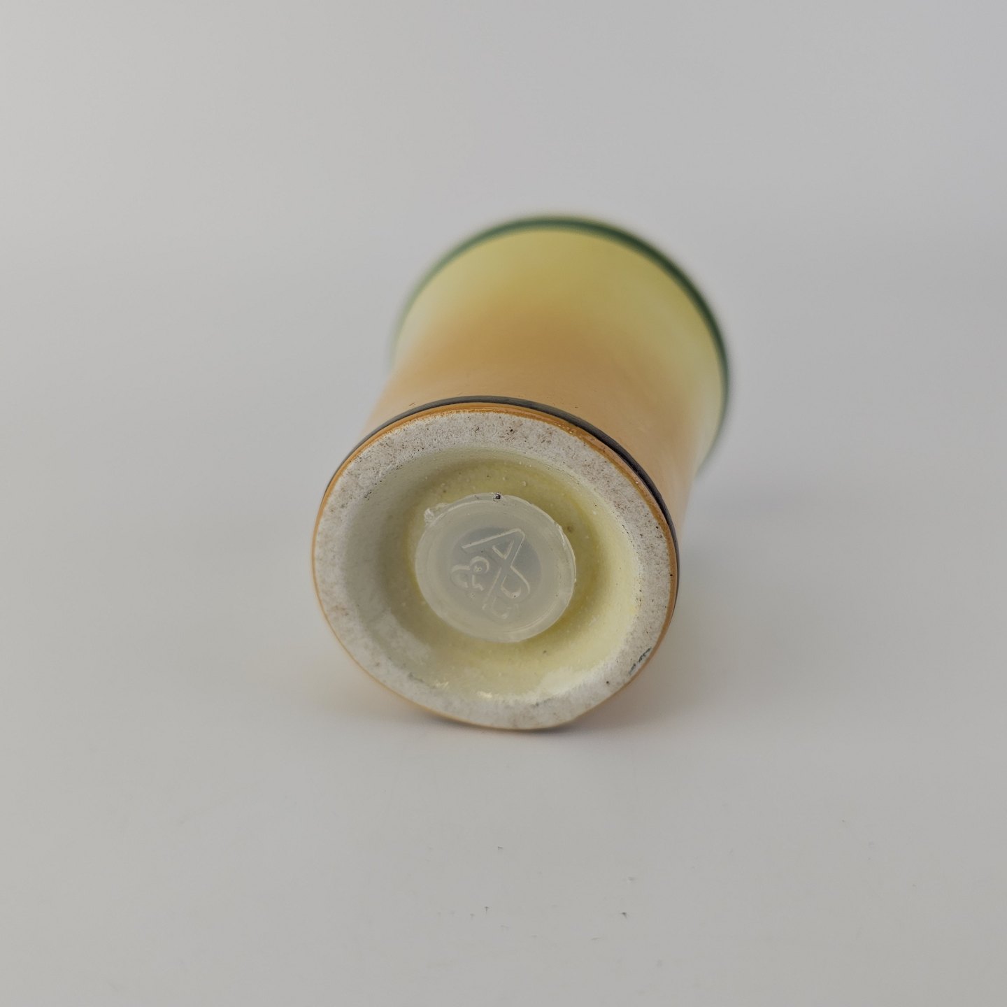 Fajancestel i stelform C med dekoration i gule nuancer med grøn stribe.