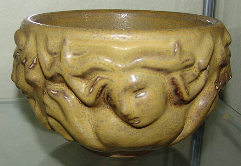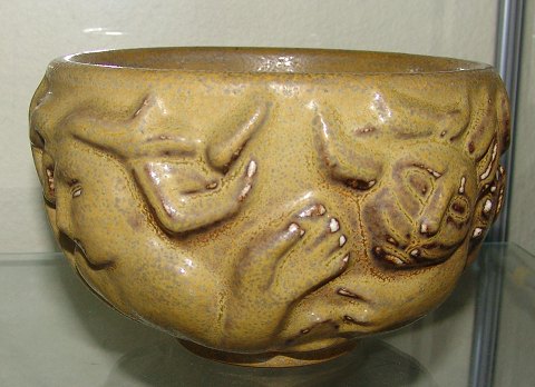 Description: Large Royal Copenhagen Helge Christoffersen vase with Kats and Girls faces. Measures 18cm wide and 12,5cm tall. Very heavy.