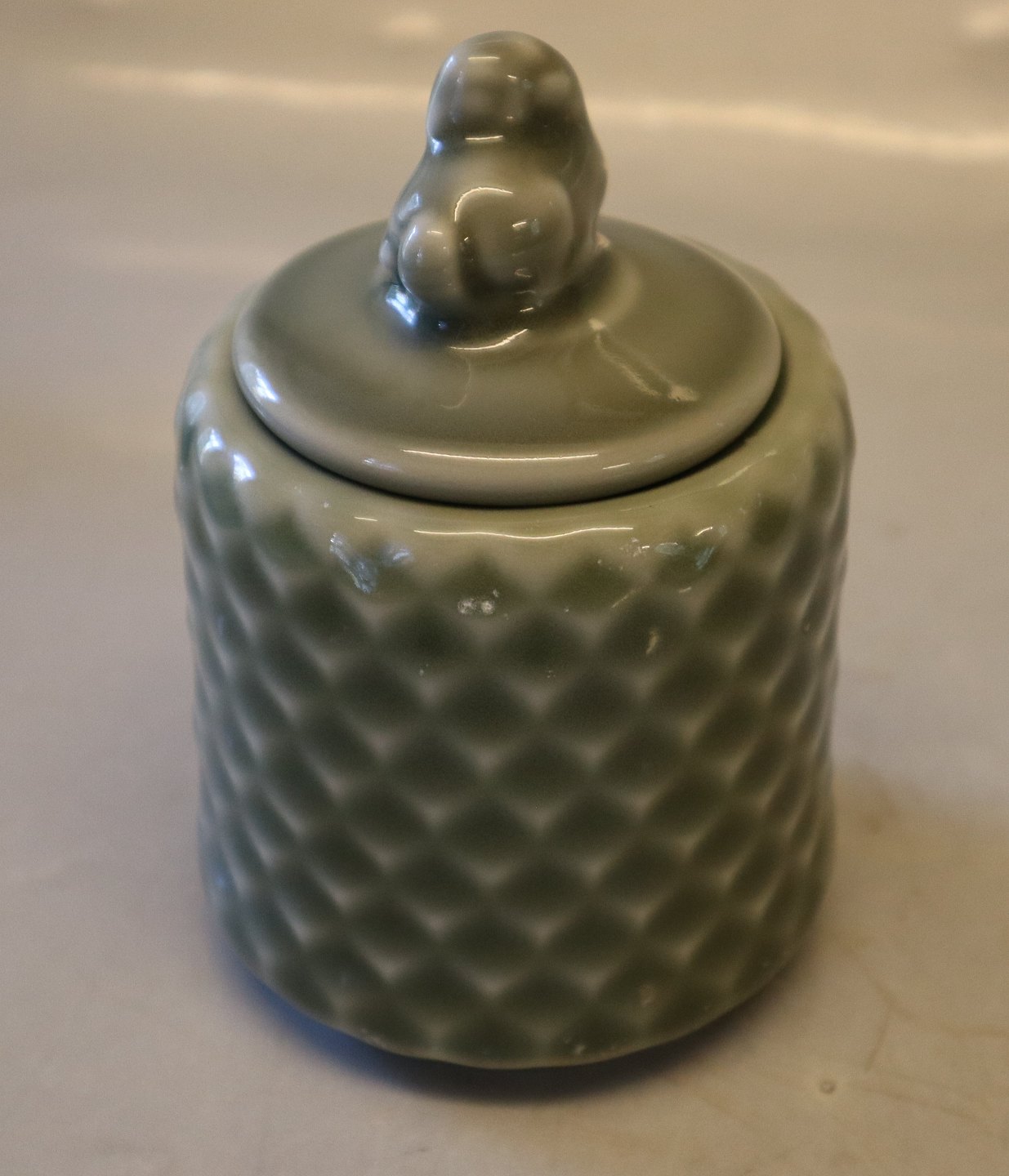 3622 Kgl. Celadon dåse med lam på toppen 12 x 7.5 cm Hans Henrik Hansen Kongelig Dansk Stentøj