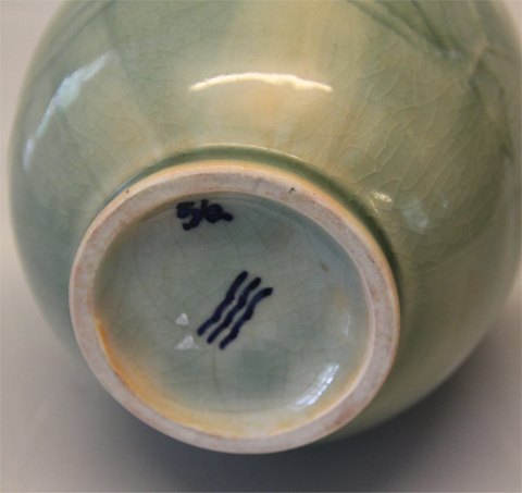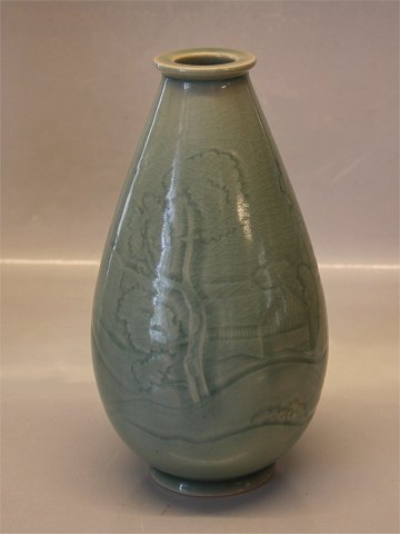 Beskrivelse: Royal Copenhagen stentøj Kgl. Celadon Vase - stentøjsmasse dekoreret med indridset landskabsmotiv, 21.5 cm I fin og hel stand