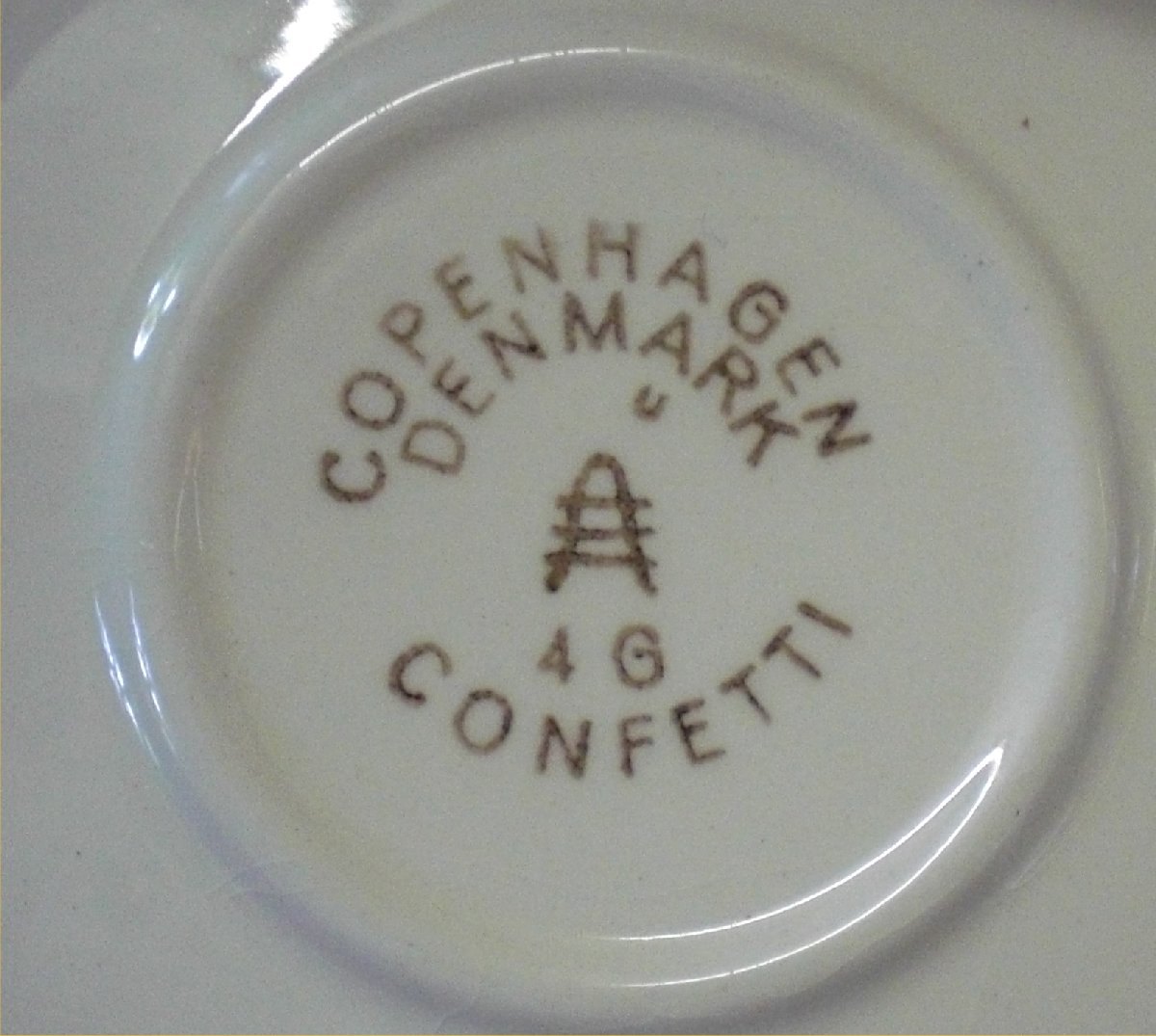 Aluminia Fajance Confetti - Frokost og kaffe/testel ca. 1956-1957 - et blandingsstel af ca. 46 genstande fra mange stelformer: Victoria II, Påfugl, Convulus, Tove kaffe/te, Elisabeth, Gudrun, Victoria III, Feston, London kopper, Dorrit, Camilla og Blå Linnea. Genstandene er dekoreret ensfarvet og udsendt i otte forskellige farver: Nr. 1 gul, nr. 2. søgrøn, nr. 3 turkis, nr. 4 blå, nr. 5 rød, nr. 6 sort, nr. 7 skovgrøn og nr. 8 violet. Nogle dele med guld indvendig
