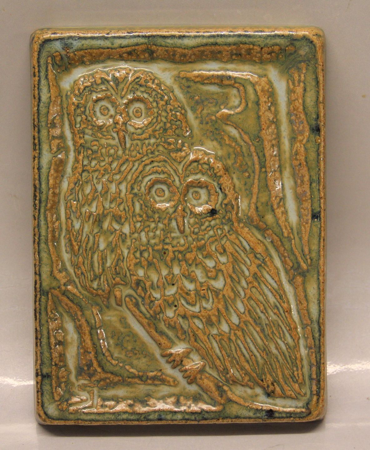 : Soeholm Relief 3502 Two Barn owls 16 x 21 cm green glaze Tile