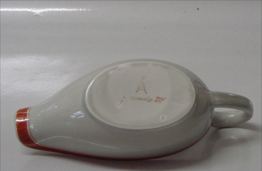 Gravy pitcher ca 8 x 18 cm Tureby - Aluminia Faience dinnerware - please contact us for stocklist and prices - decoration 254 design Nils Thorsson 1934 Red ribbon and gold - handpainted on the Victoria III form