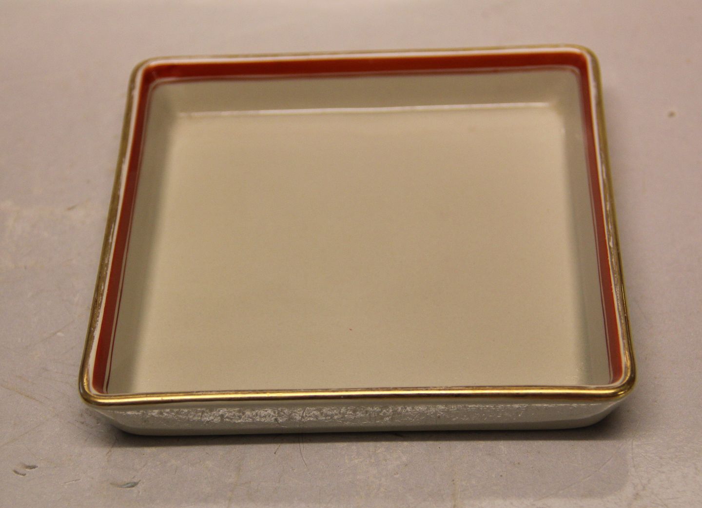 Sqaure tray for crudity 13.7 cm Tureby - Aluminia Faience dinnerware - please contact us for stocklist and prices - decoration 254 design Nils Thorsson 1934 Red ribbon and gold - handpainted on the Victoria III form