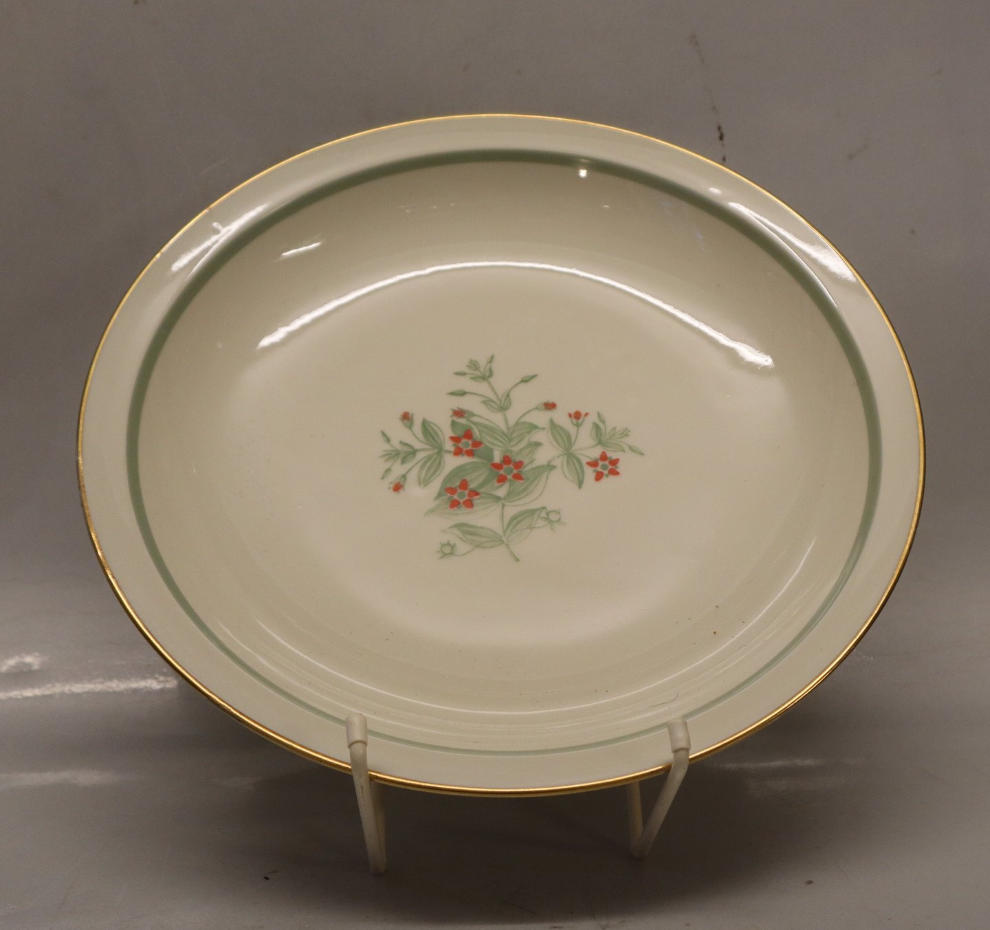 Kgl. 1010 Fensmark : Cremefarvet glasur, koralrød blomst med grønne blade, grønt bånd og guldfilet. Dekorationen med Rød Arve, populært kaldet "Grine til Middag" Det latinske navn: Ana Gallis Arvensis. Design Thorkild Olsen før 1961