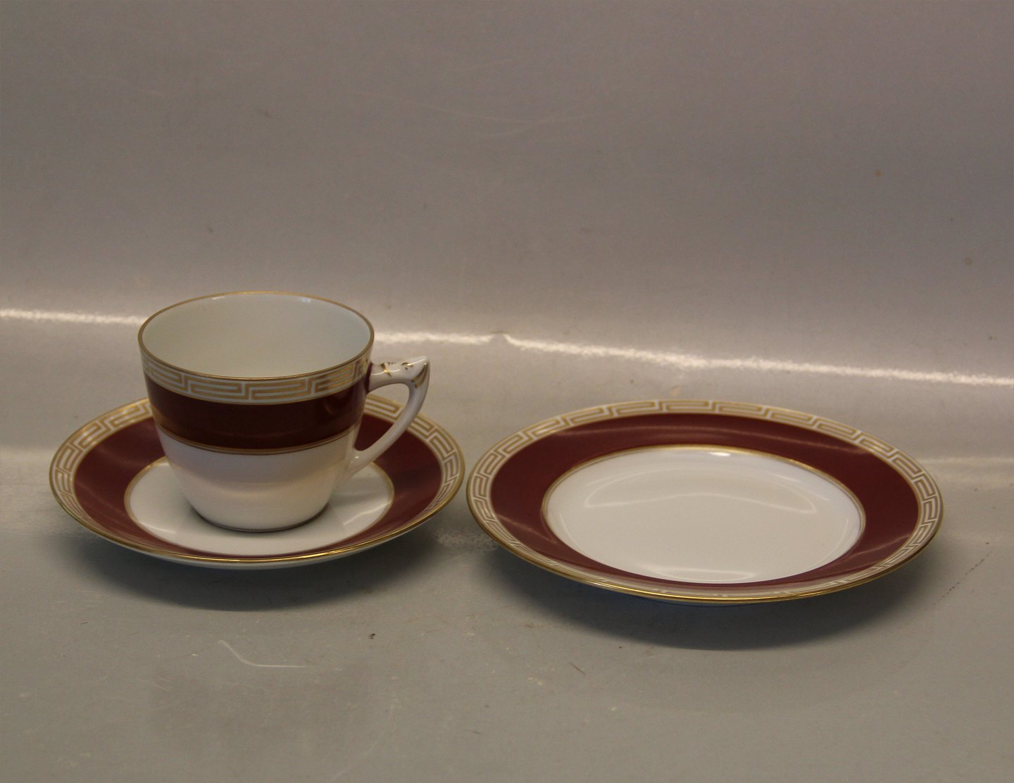 028 a Cake plate 15.5 cm (306) Wagner Bing and Grondahl White base, rust red border, à la Grecque gold rim, form 469 and form 601