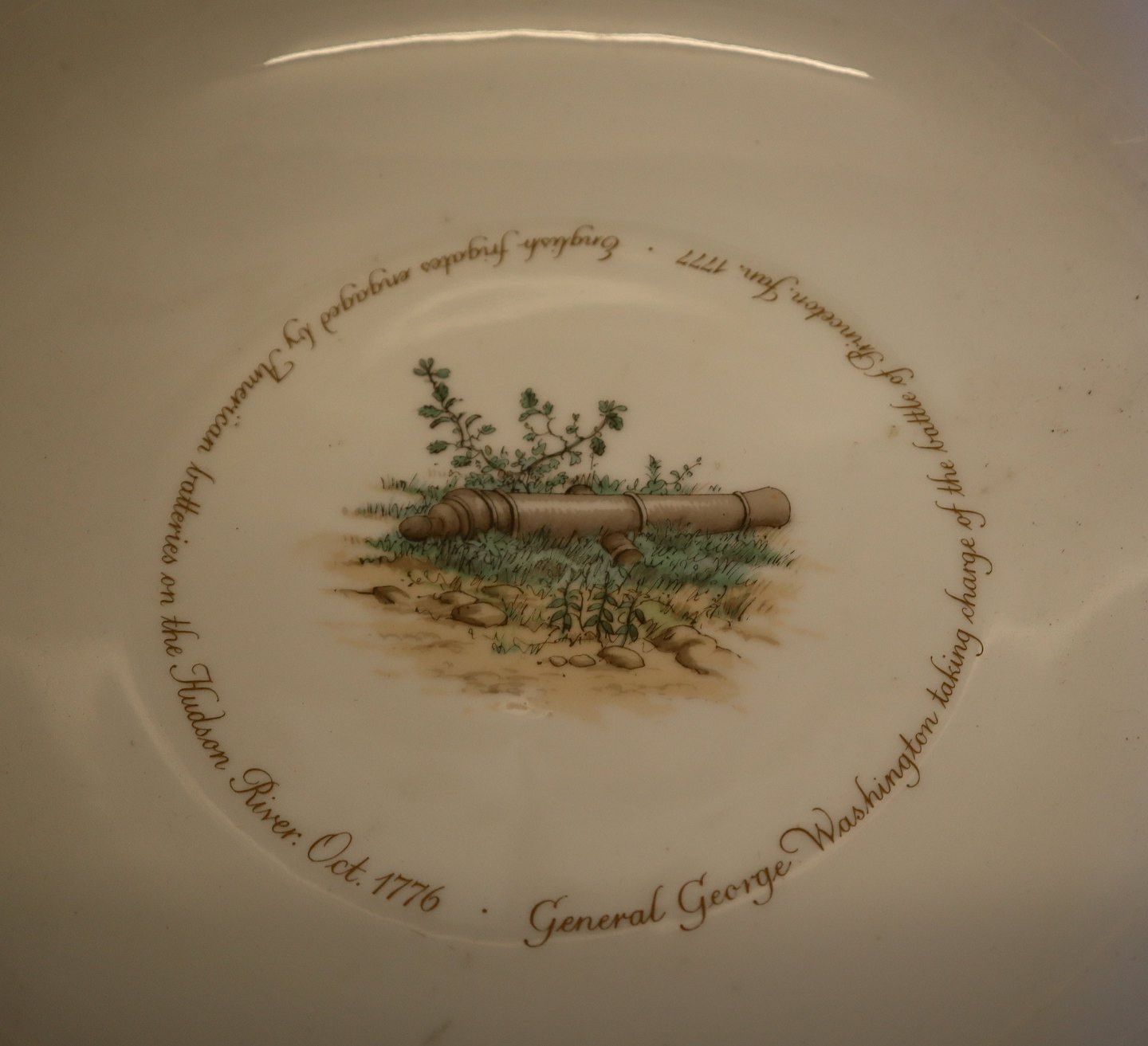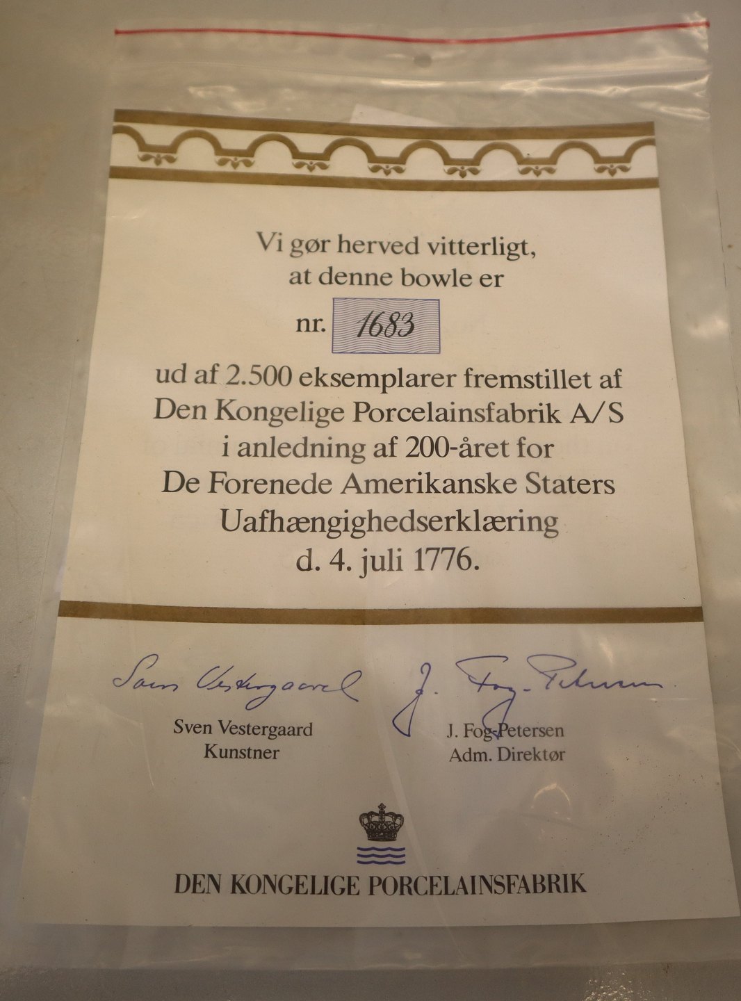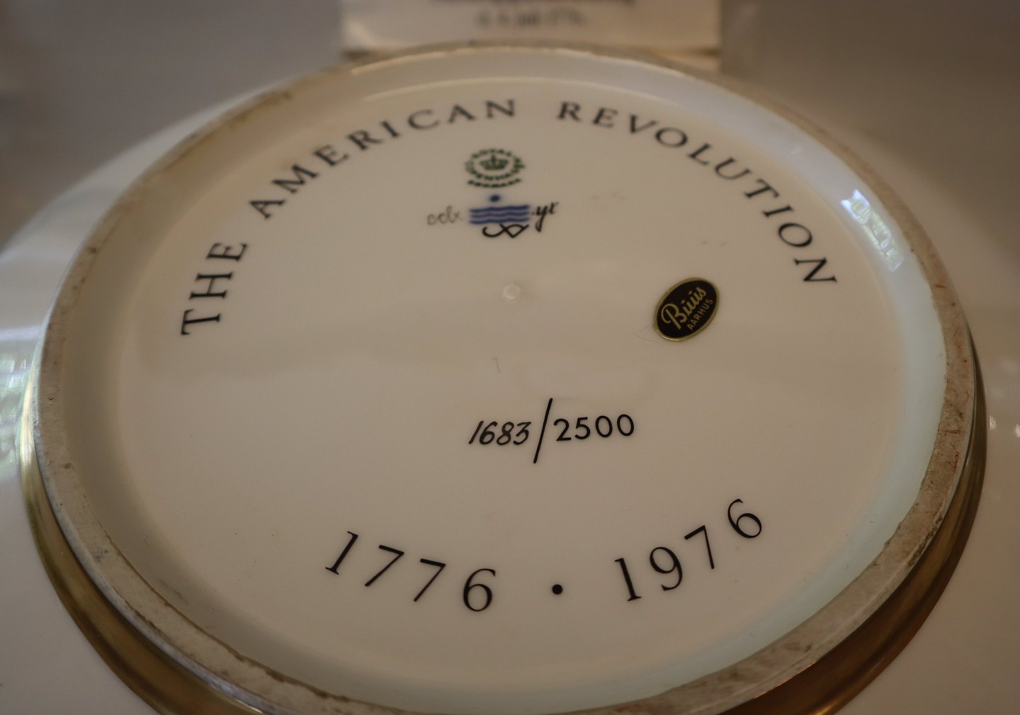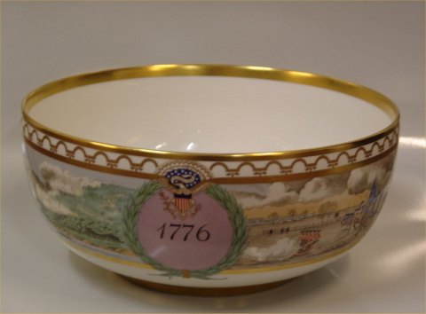 Description: The Independence Bowl. In 1975. Royal Copenhagen Porcelain mad a limited number of bowls (a replica of a commemorative punch bowl from 1801) to make the occasion of their 200th birthday. In view of the intense interest these have generated amongst collectors all over the world, they found that the signing of the declaration of Independence of the United States of America in 1776 a fitting occasion to issue this unique Independence bowl. Only 2500 numbered bowls have been made. The sensitive frieze decoration over the glaze (by Royal Copenhagen artist Sven Vestergaard) featuring George Washington at the Battle of Princeton, English frigates engaged by American batteries on the Hudson River, a silhouette of George Washington and a contemporary coat of arms.