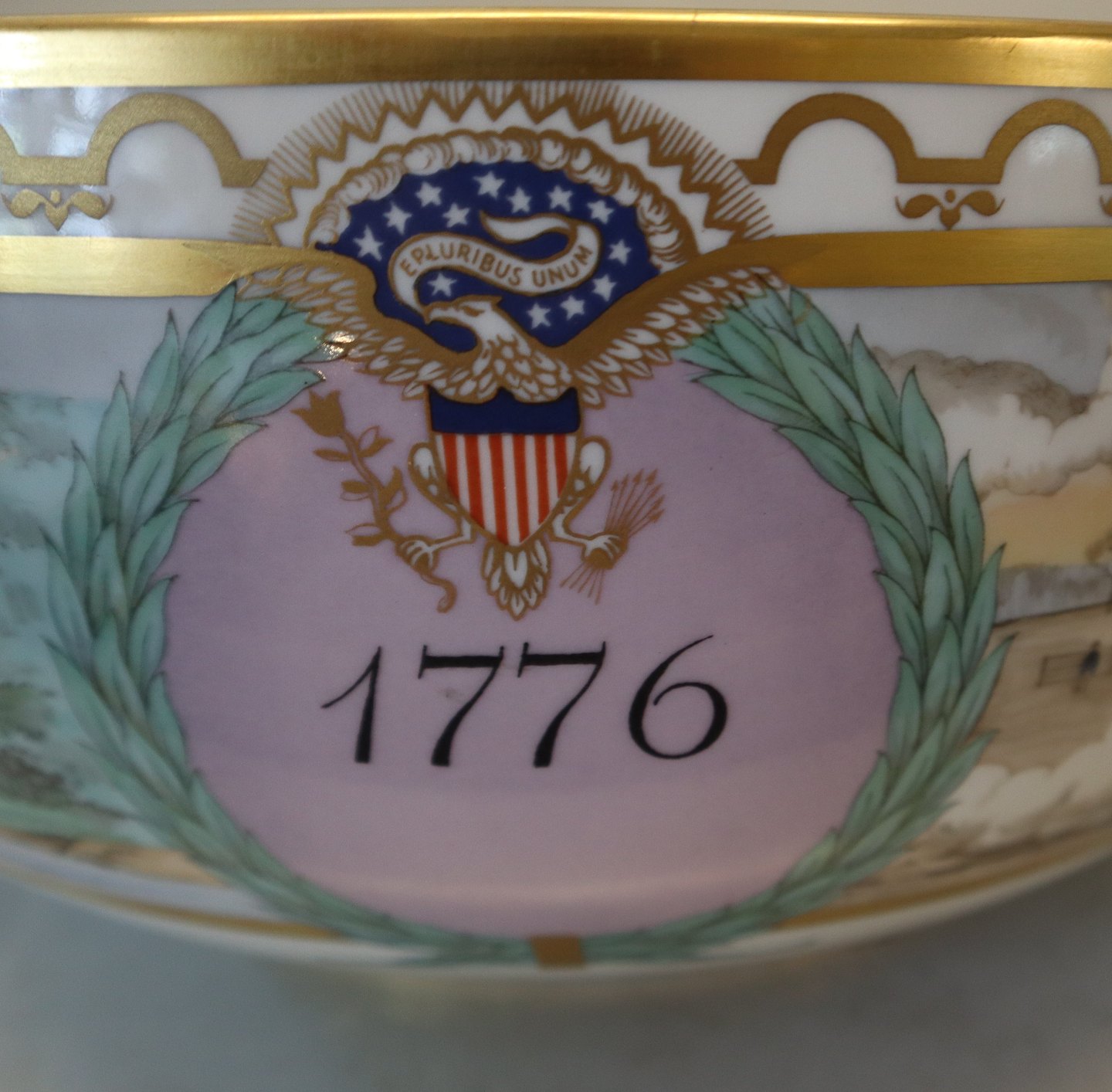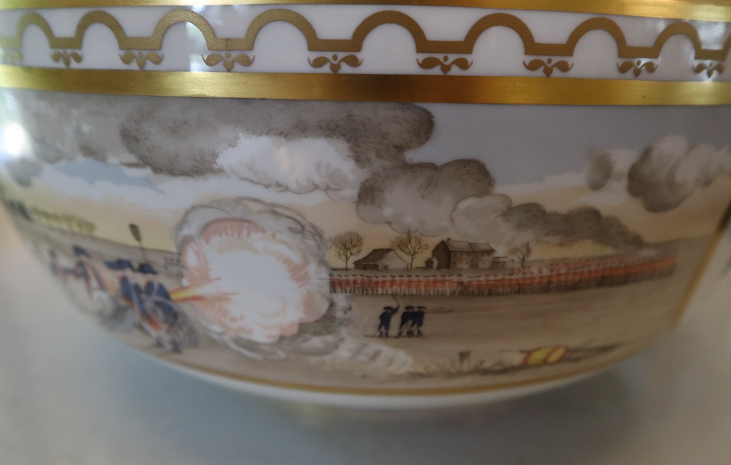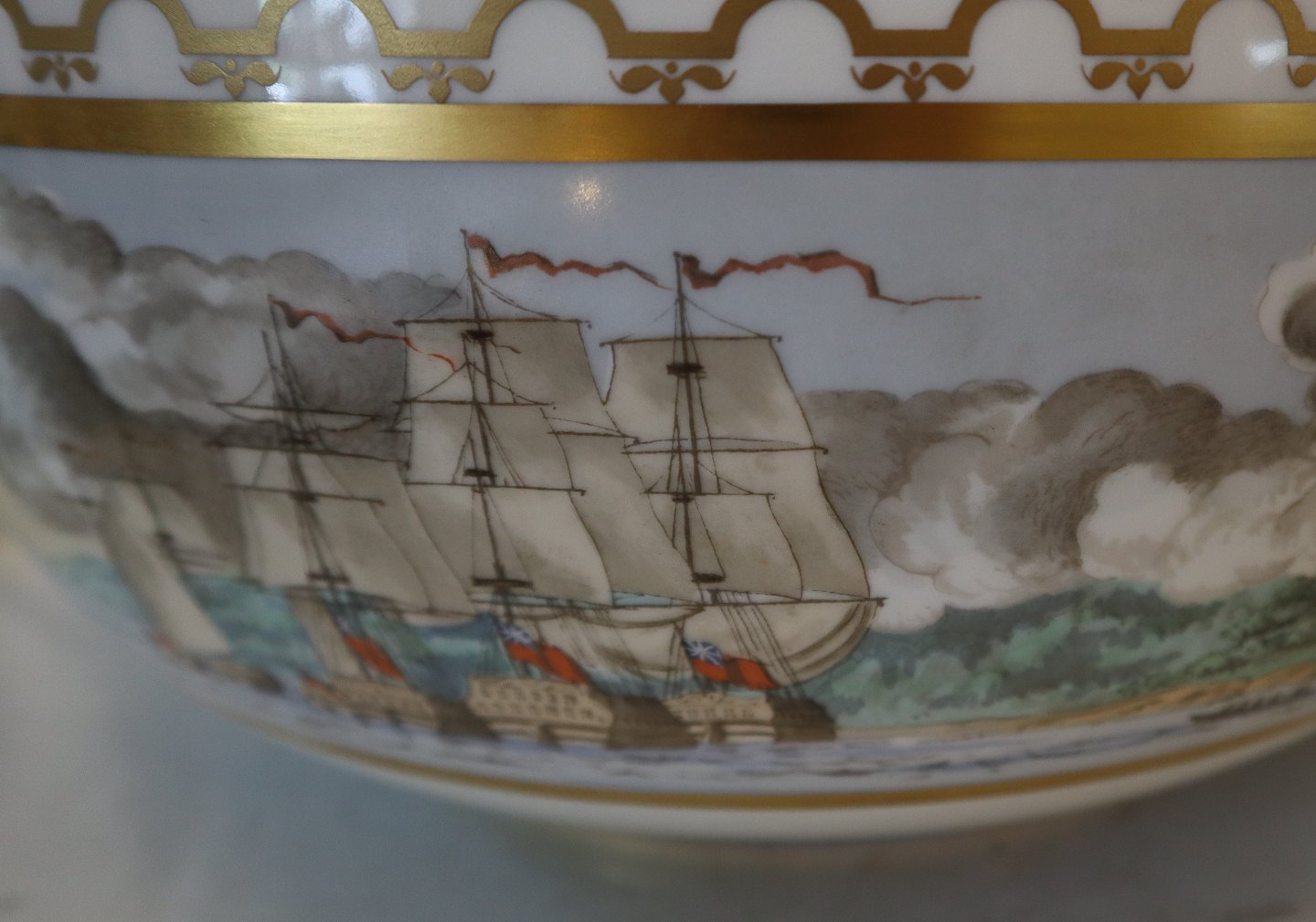 Description: The Independence Bowl. In 1975. Royal Copenhagen Porcelain mad a limited number of bowls (a replica of a commemorative punch bowl from 1801) to make the occasion of their 200th birthday. In view of the intense interest these have generated amongst collectors all over the world, they found that the signing of the declaration of Independence of the United States of America in 1776 a fitting occasion to issue this unique Independence bowl. Only 2500 numbered bowls have been made. The sensitive frieze decoration over the glaze (by Royal Copenhagen artist Sven Vestergaard) featuring George Washington at the Battle of Princeton, English frigates engaged by American batteries on the Hudson River, a silhouette of George Washington and a contemporary coat of arms.