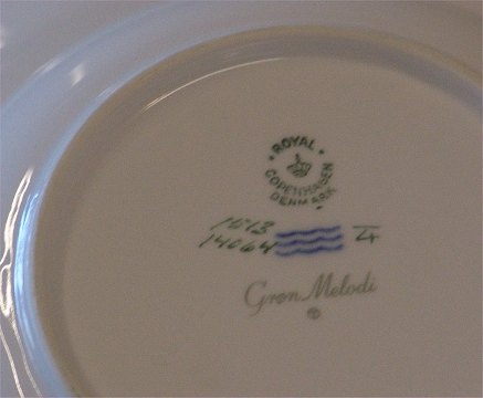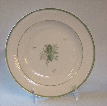 1513-14060 Kagetallerken 15 cm Grøn Melodi #1513 (Kgl.) Rillet form, hvid glasur, grøn dekoration, grønt båd og guldfilet. Royal Copenhagen Green Melody