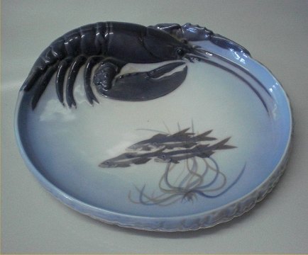 Description: Royal Copenhagen 0485 Large Card tray - lobster with fish and seawead Erik Nielsen 1896 5 x 28 x 26 cm