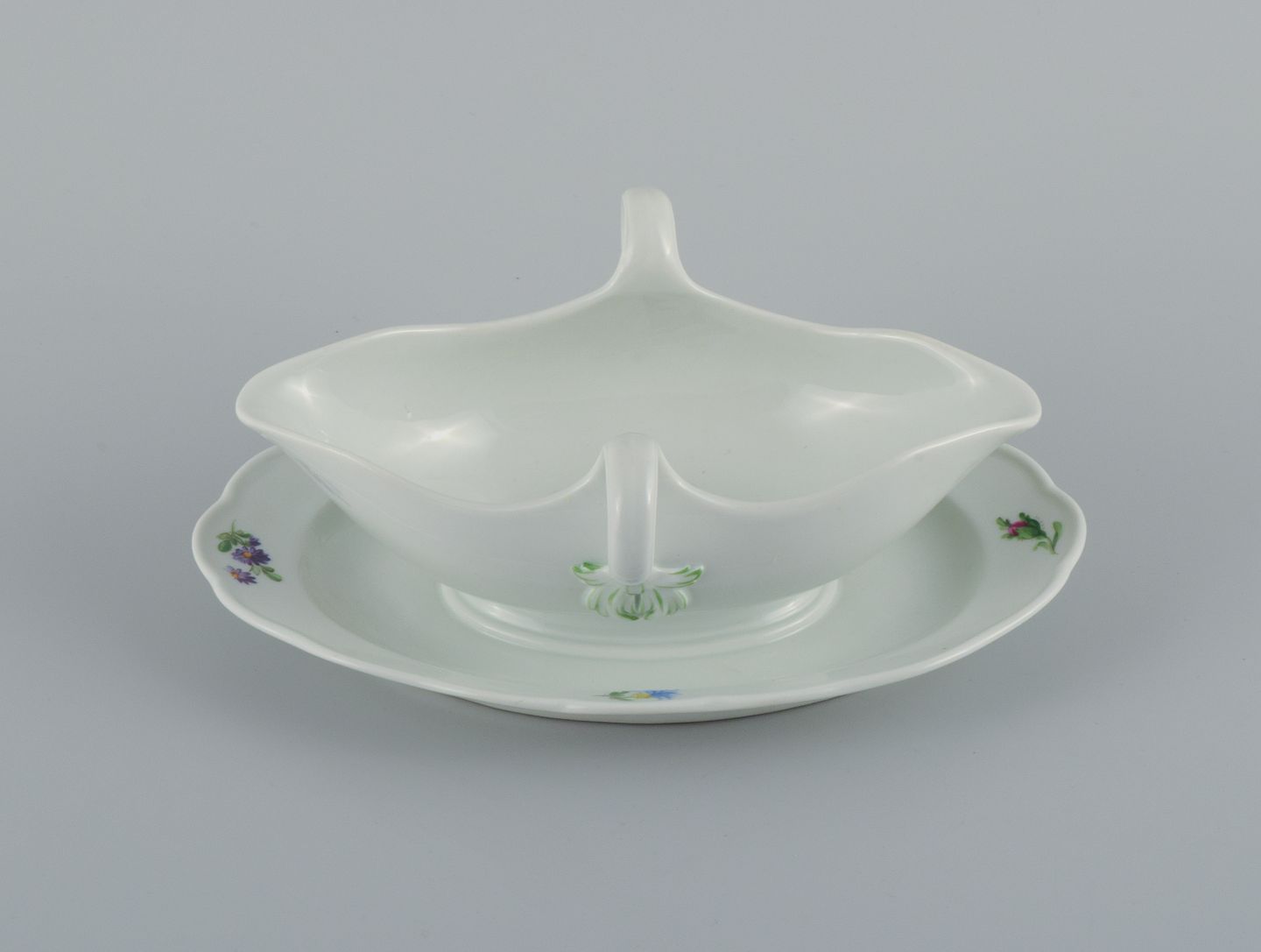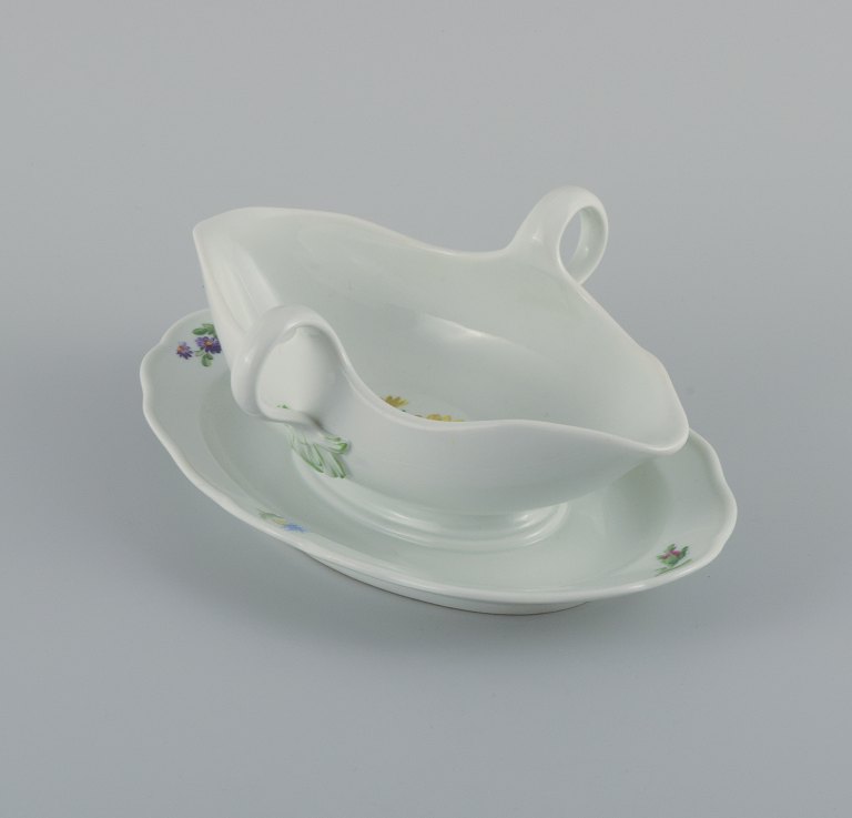 Meissen, sauce pot hand painted with flowers. Late 19th century. In perfect condition. Third factory quality. Marked. Dimensions: L 25.5 x H 9.5 cm.