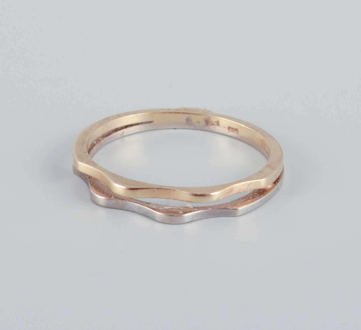 14 karat gold ring in white gold and rose gold. Modernist design. Mid-20th century. Makers mark: SC. In excellent condition. Ring size: 18 mm. (US approx. 8)
