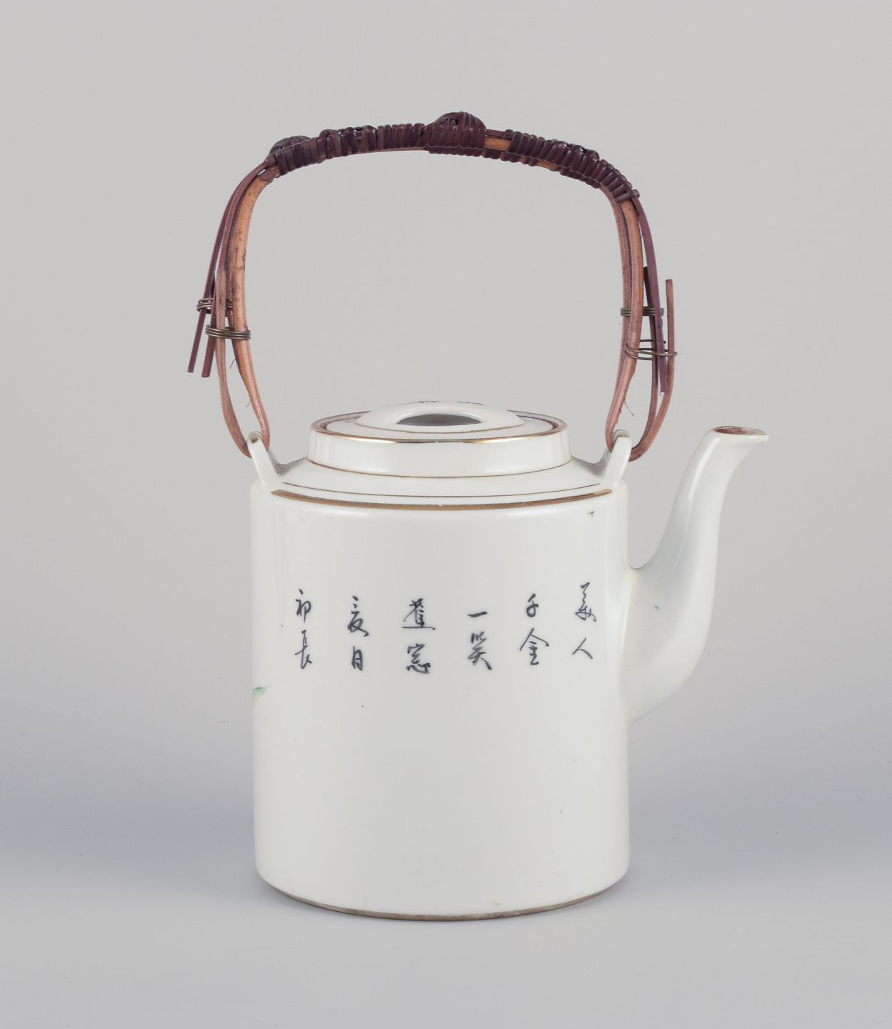 Chinese porcelain teapot. Bamboo handle. Hand-painted motif of women in a landscape. Circa 1930. Perfect condition. Marked. Dimensions: W 17.0 cm x H 16.0 cm (without handle).