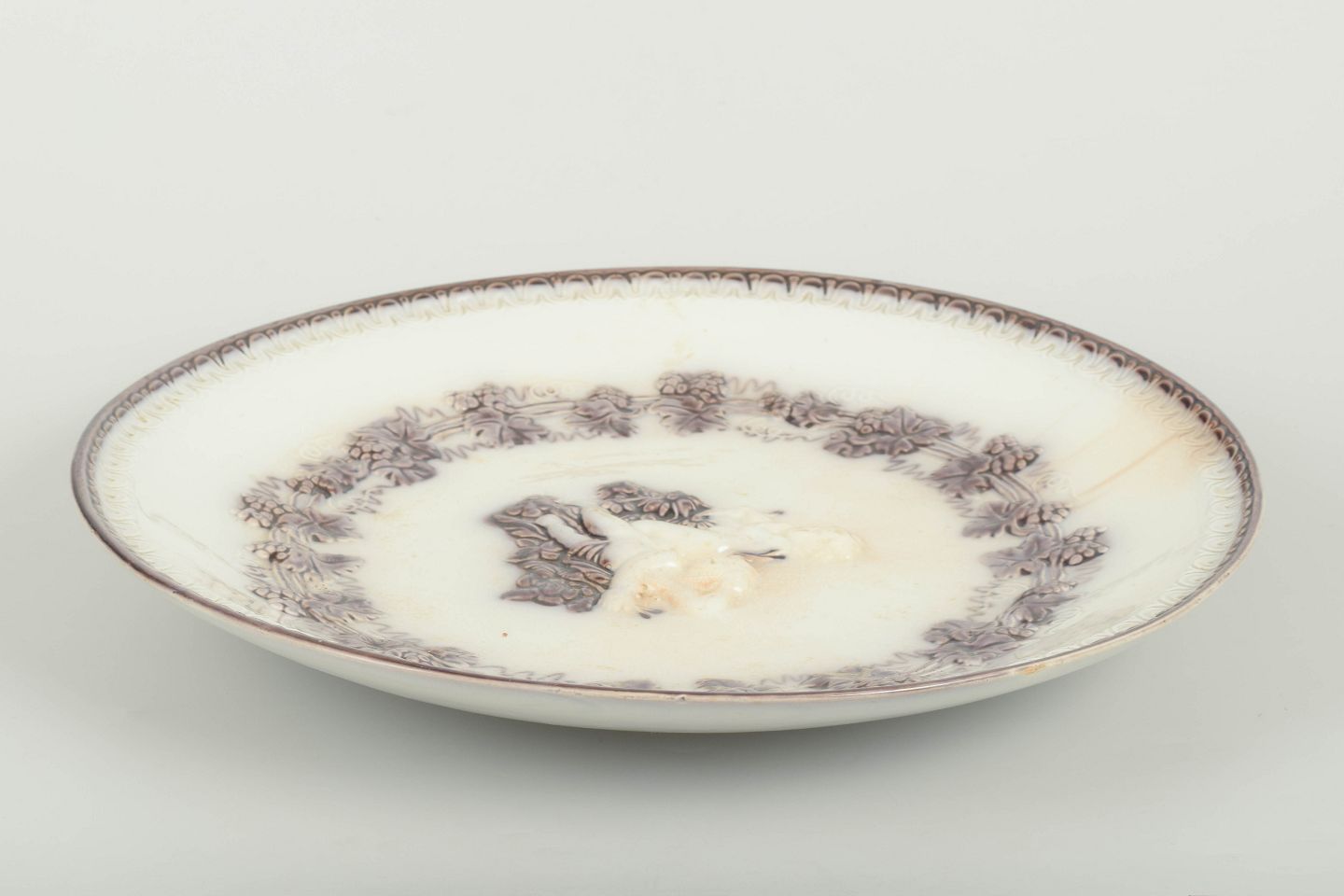 Round faience plate with relief decoration and transfer-printed vine motif in brown tone, centrally decorated with putti figures (cherubs/angels).