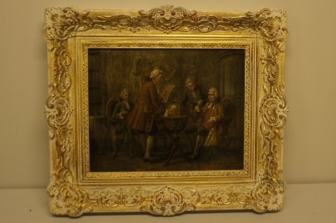 Her tilbydes et oliemaleri på lærred. Rococo interiør med gentlemen af A. Stadlmeyer, tysk kunstner.