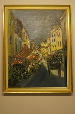 Her tilbydes et oliemaleri på lærred. Fra Paris. Kondition : God Mål uden rammen: 48cm. x 66 cm. Rammen er 5 cm. bred.