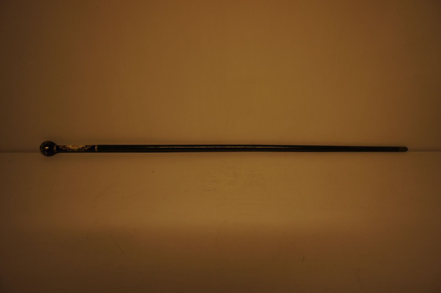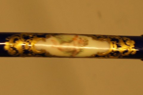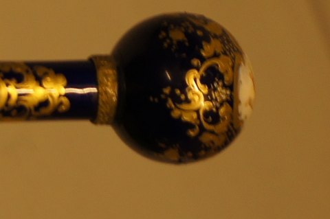 Porcelæns-stok ca. 1890, sandsynligvis Meissen, malet med amoriner, rige kobolt farver, forgyldte metal kraver, palisander skaft. I god stand. 91½ cm. lang.