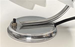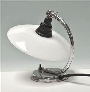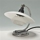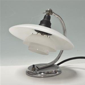 Natbordslampe af forniklet metal, monteret med Poul Henningsen PH 2/1 pendel, skærmsæt af hvide opalglas, stofledning. 23 x 20 cm. Fremstår i god stand.