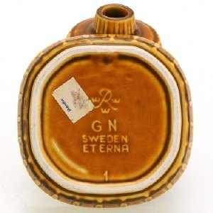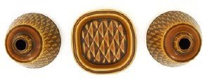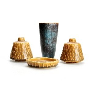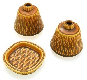 KERAMIK, 4 dele, GUNNAR NYLUND for Rörstrand 3 dele "Eterna" med triangel formet dekoration i relief. Højeste vase : 15 cm. høj. BLÅ VASE SOLGT ! I god stand.