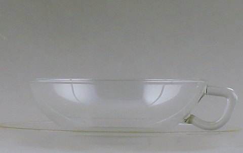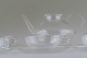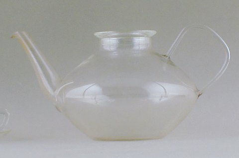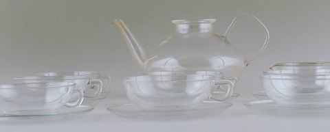 Wilhelm Wagenfeld: "Jena". Thestel af klart glas bestående af 1 L. thekande, 7 thekopper med underkopper og flødekande. Mrk. Jenaer Glas. I god stand. Thekande 24 cm. lang og 13 cm høj.
