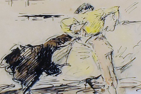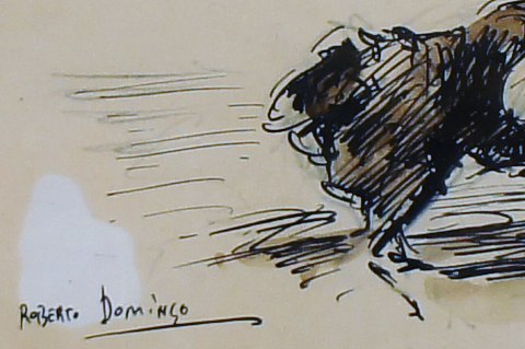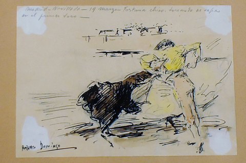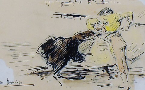 Roberto DOMINGO Y FALLOLA (1883-1956) Gouache på papir, tyrefægterscene, dramatisk scene med toreador der nedlægger en tyr. I god stand, 21x15 cm. Signeret samt med gammelt mærkat fra kunsthandler i Madrid.