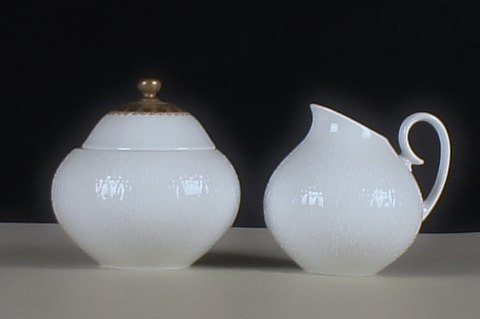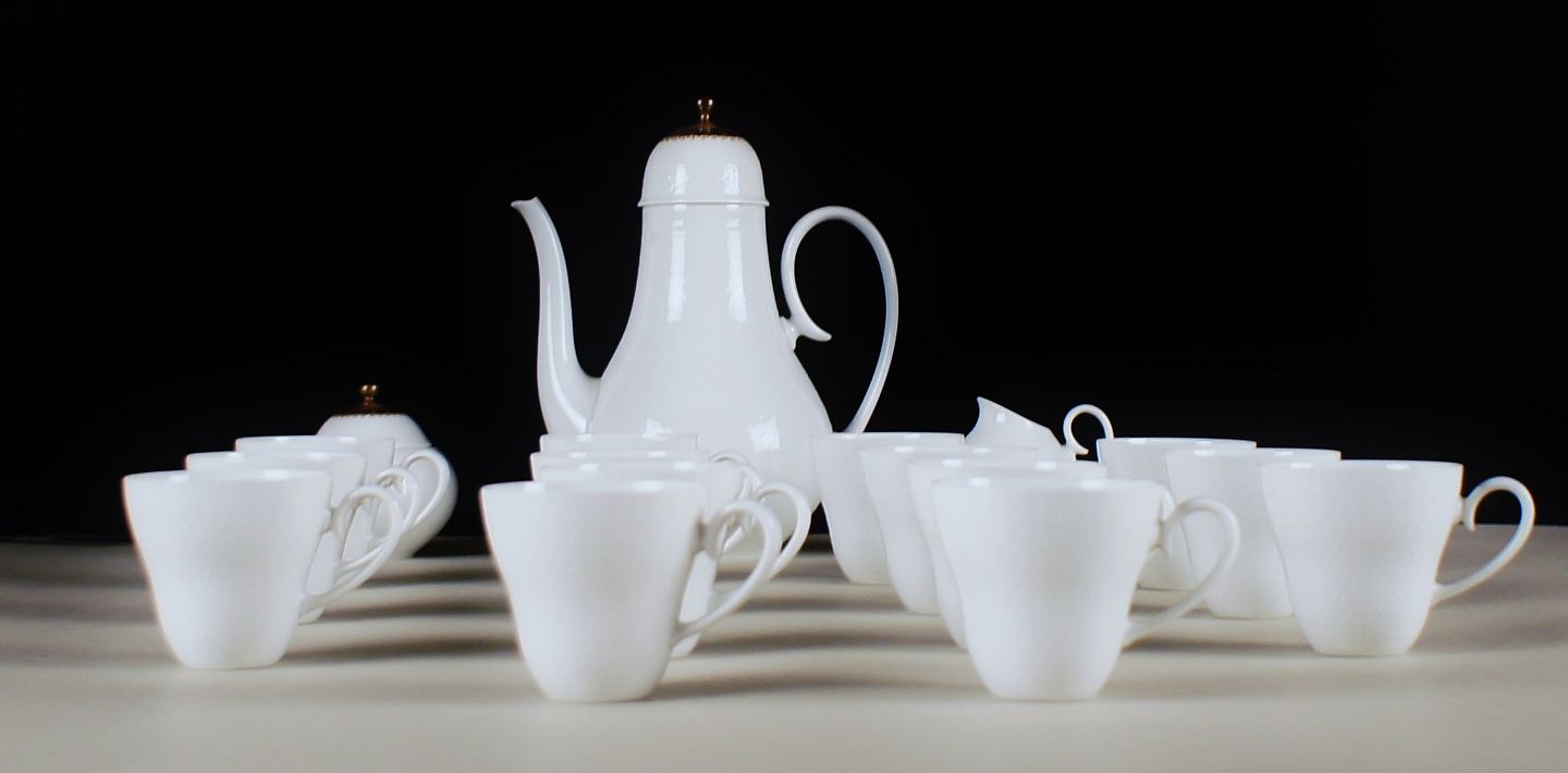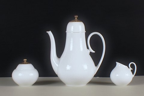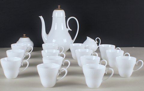 Rosenthal, Bjørn Wiinblad. Mocca-service med guld dekoration, bestående af 14 moccakopper, kaffekande, sukkerskål og flødekande. I god stand. Kaffekande : 20 cm. høj. Moccakop 6½ cm. høj.