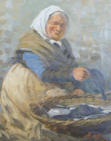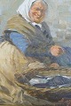 Her tilbydes et oliemaleri på lærred. Fiskerkone, Gl. Strand. Ca. 1930´erne. Signeret S C Bjulf for Søren Christian Bjulf.