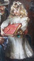 Interiør, bedstefar og pige. Olie på lærred, uidentificeret kunstner, utydeligt signeret. 1920'erne. Indrammet i tung forgyldt træramme. Måler 52x63 cm, måler 72x84 cm. med ramme.