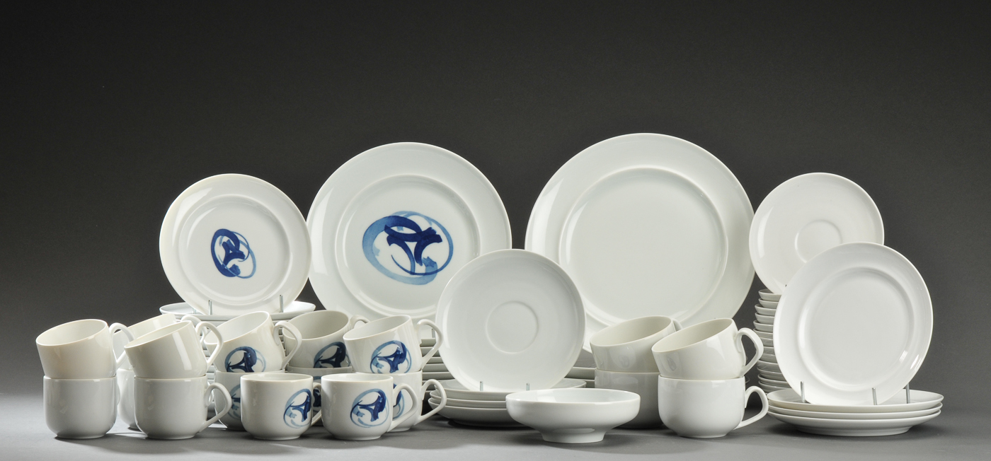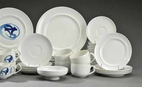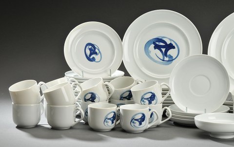 B&G Henning Koppel. "Koppel" og "Blå Koppel" kaffe/spisestel, bestående af, 4 kaffekopper nr. 475, 8 kaffekopper nr. 305, 9 underkopper nr. 305, 4 underkopper nr. 475, 4 kagetall. nr. 616, 8 kagetall. nr. 306, 4 frokosttall. nr. 326,. i Koppel nr. 325. Fremstillet hos Bing &Grøndahl. Overvejende 1. sortering. Fra kr. 150 pr. del.