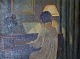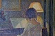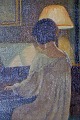Aage Jessen, f. Vinkel ved Viborg 1876, d. 1961. Interiør med læsende kvinde ved lampens skær. Sign. Aage Jessen. Olie på lærred. 29 x 38.5. Guldrammen er 9 cm. bred. I god stand.