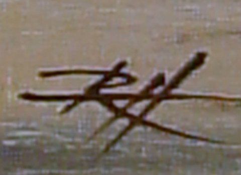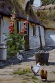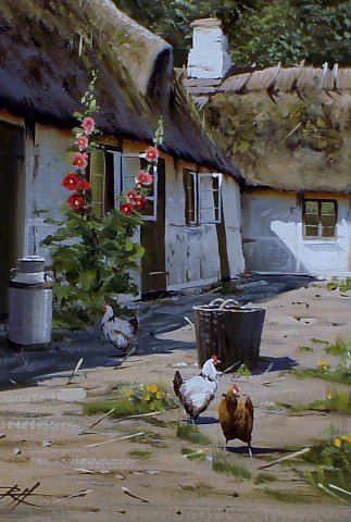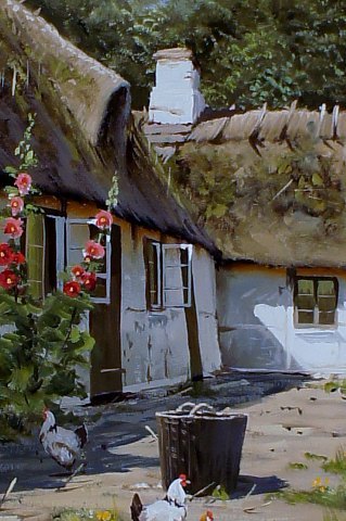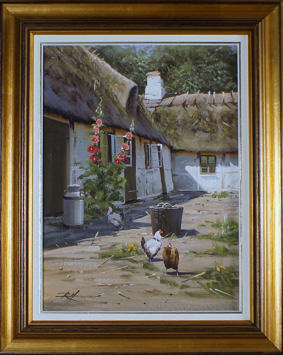 Olie på lærred, Roald Hansen (Født 1938) Idyllisk exteriør med stråtækt hus og høns på gårdspladsen. Måler 30 x 40 cm.