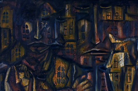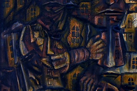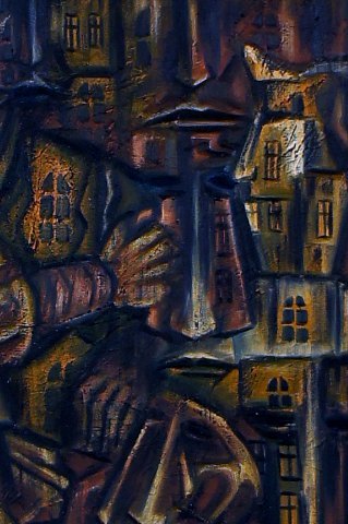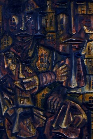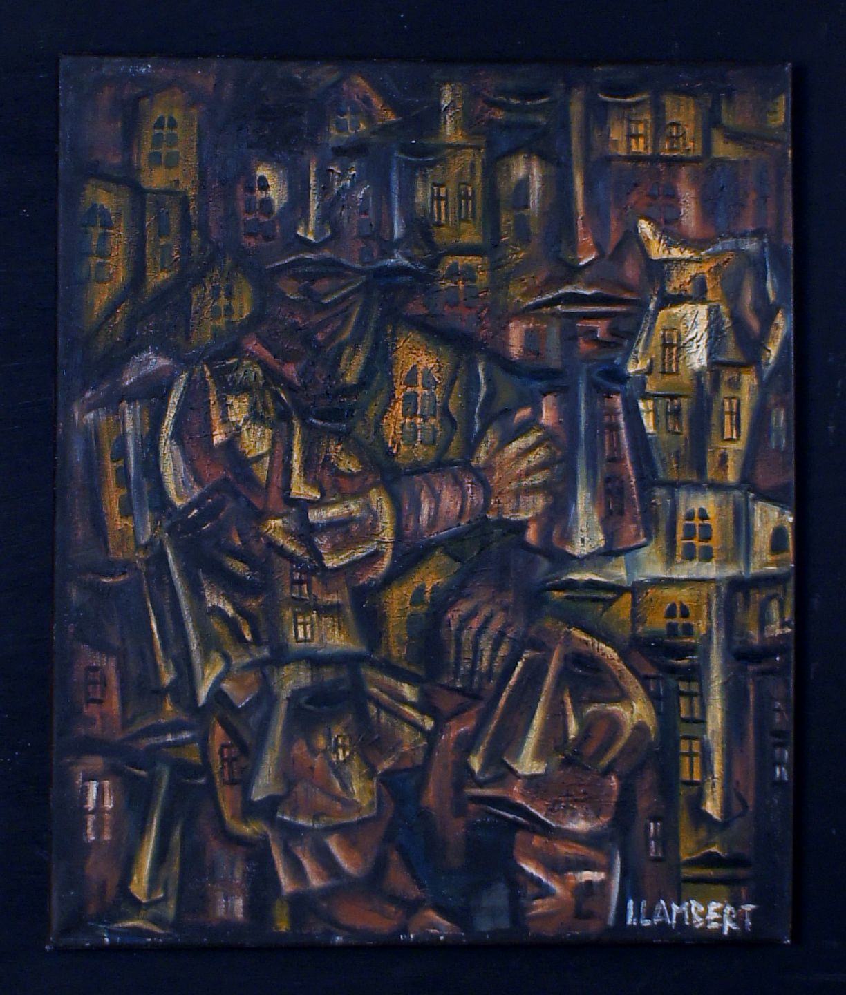 Olie på lærred, signeret Lambert, contemporary fransk kunstner. Abstrakt motiv, person med huse i baggrunden. I perfekt stand. Måler : 49 x 59 cm. Uden ramme.