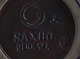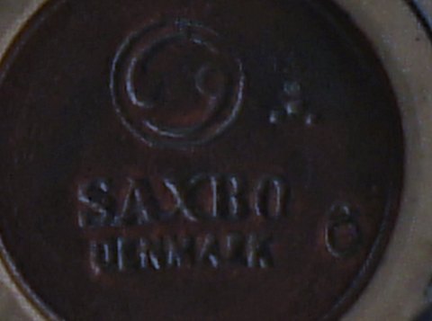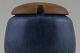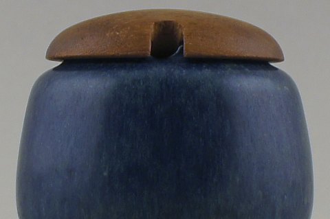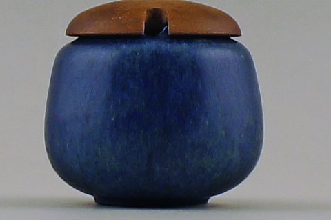 Saxbo jam jar in ceramic, beautiful blue glaze, lid in teak. Yin yang stamp. In good condition. 10 x 10 cm.