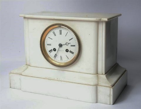 White marble clock, France app. 1900. 21 cm. x 30.5 cm. In good condition, some wear.