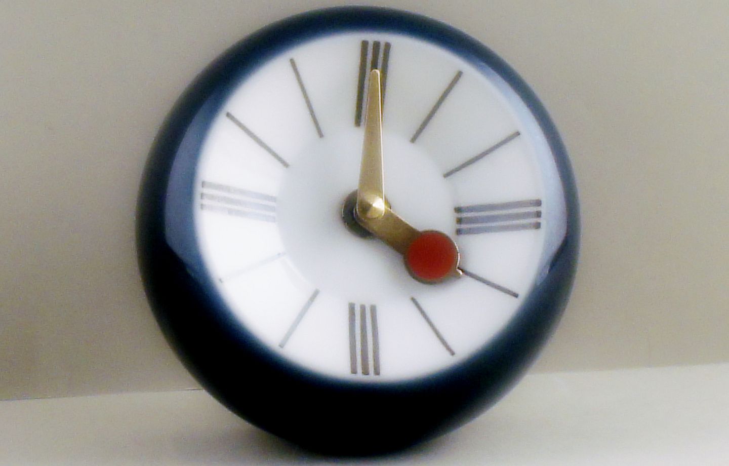 Royal Copenhagen vægur, batteridrevet, blå glasur. Designet af Snorre Læssøe Stephensen i 1965. Måler 8 x 11 cm. 1. sortering, i perfekt stand.