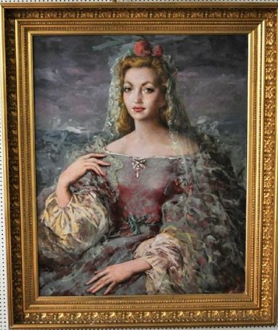 Enrique OCHOA (1891-1978) Portræt af ung dame med slør i en smuk kjole, oliemaleri på lærred. Signeret. 79x64 cm.